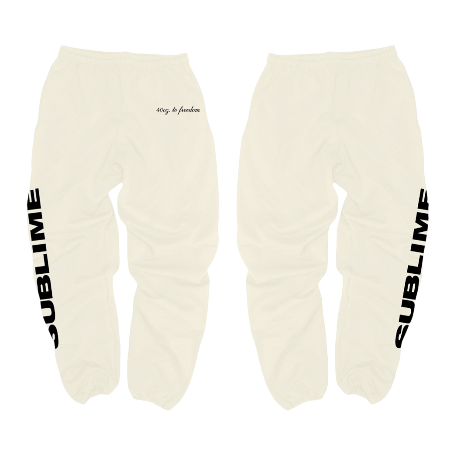 Classic fitting unisex sweatpants in off-white featuring 40oz To Freedom printed on the left hip and Sublime logo printed down the right leg.