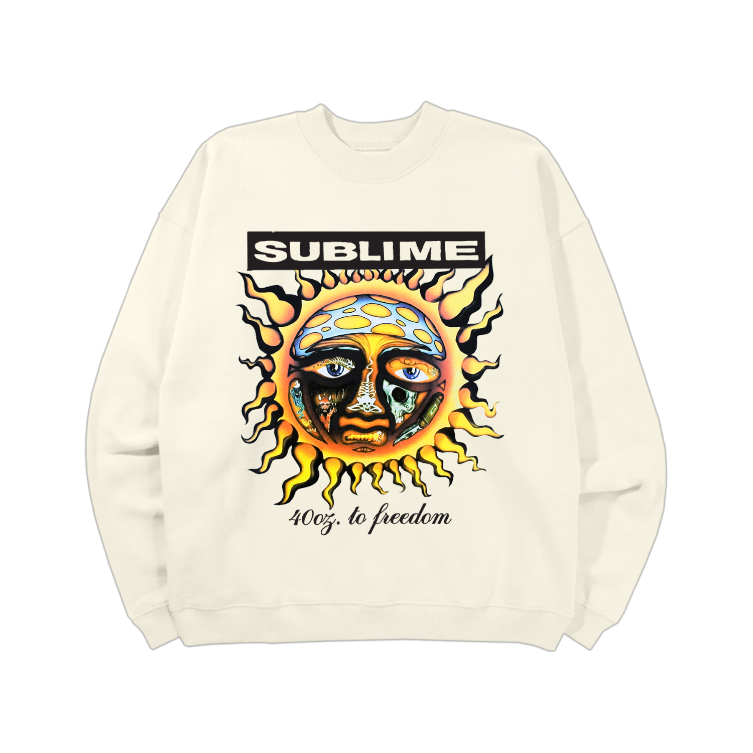 Classic fitting unisex sweatshirt in off-white featuring a Sublime 40oz To Freedom sun design printed on the front.