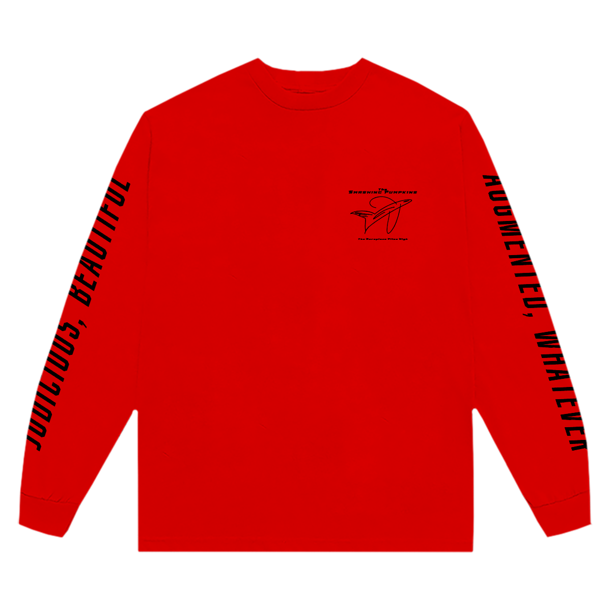 A unisex red longsleeve inspired by The Aeroplane Flies High boxset. Featuring all of the song titles from the release and lyrics from "The Aeroplane Flies High (Turns Left, Looks Right)" on the sleeves.