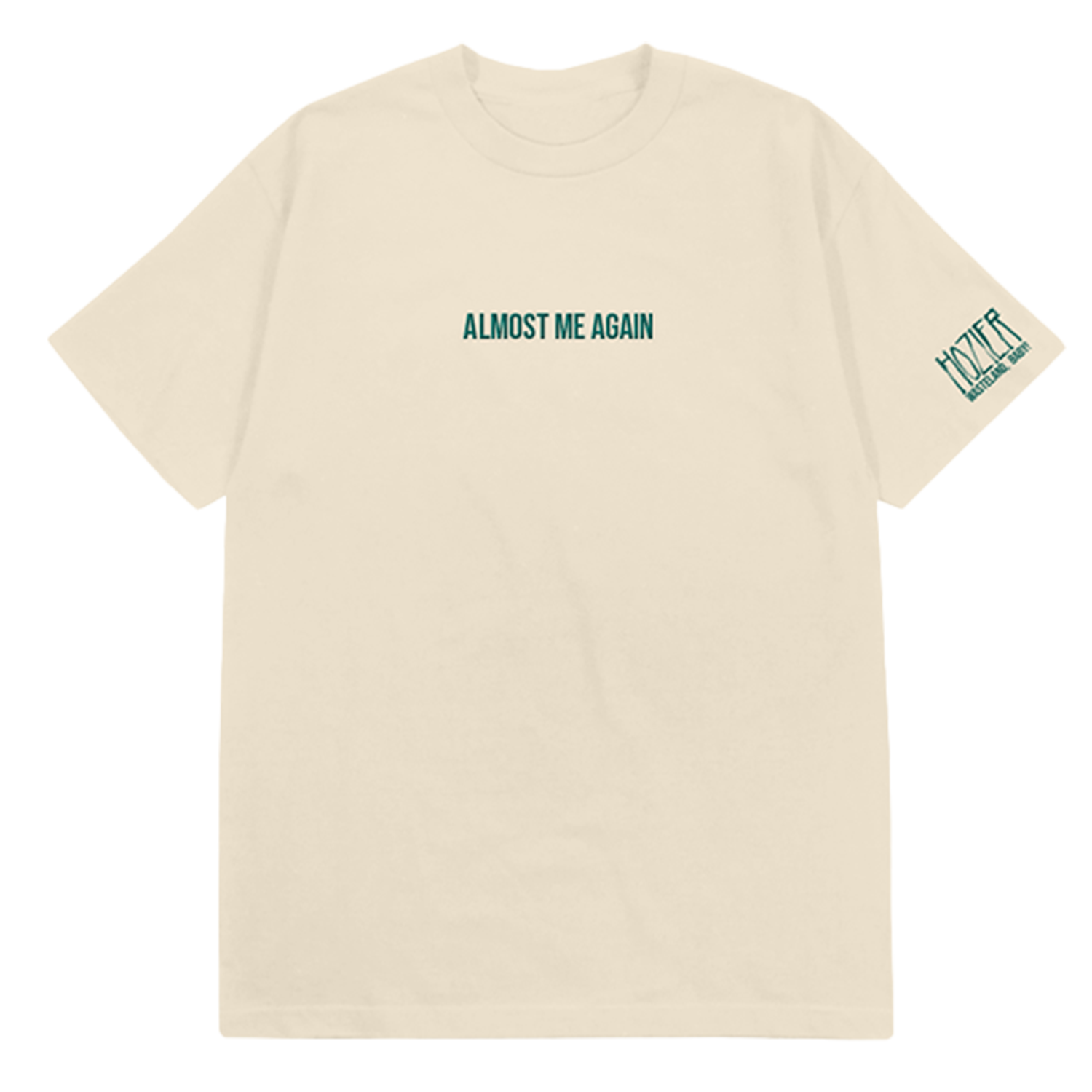Sand tee featuring embroidered 'Almost Me Again' lyric artwork from the song ‘Sweet Music’ on the front and Hozier logo on the sleeve.