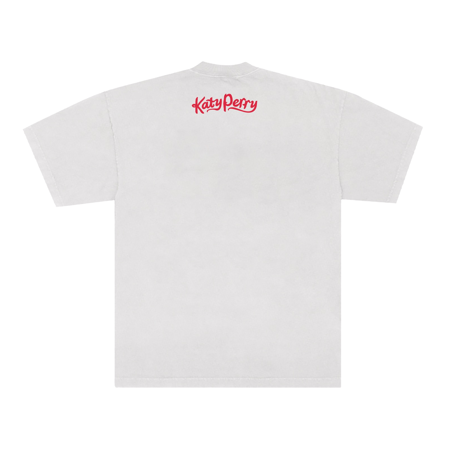 Unisex, white, 100% cotton t-shirt featuring iconic throwback photo of Katy Perry and her banana phone on the front and Katy Perry logo on the back.