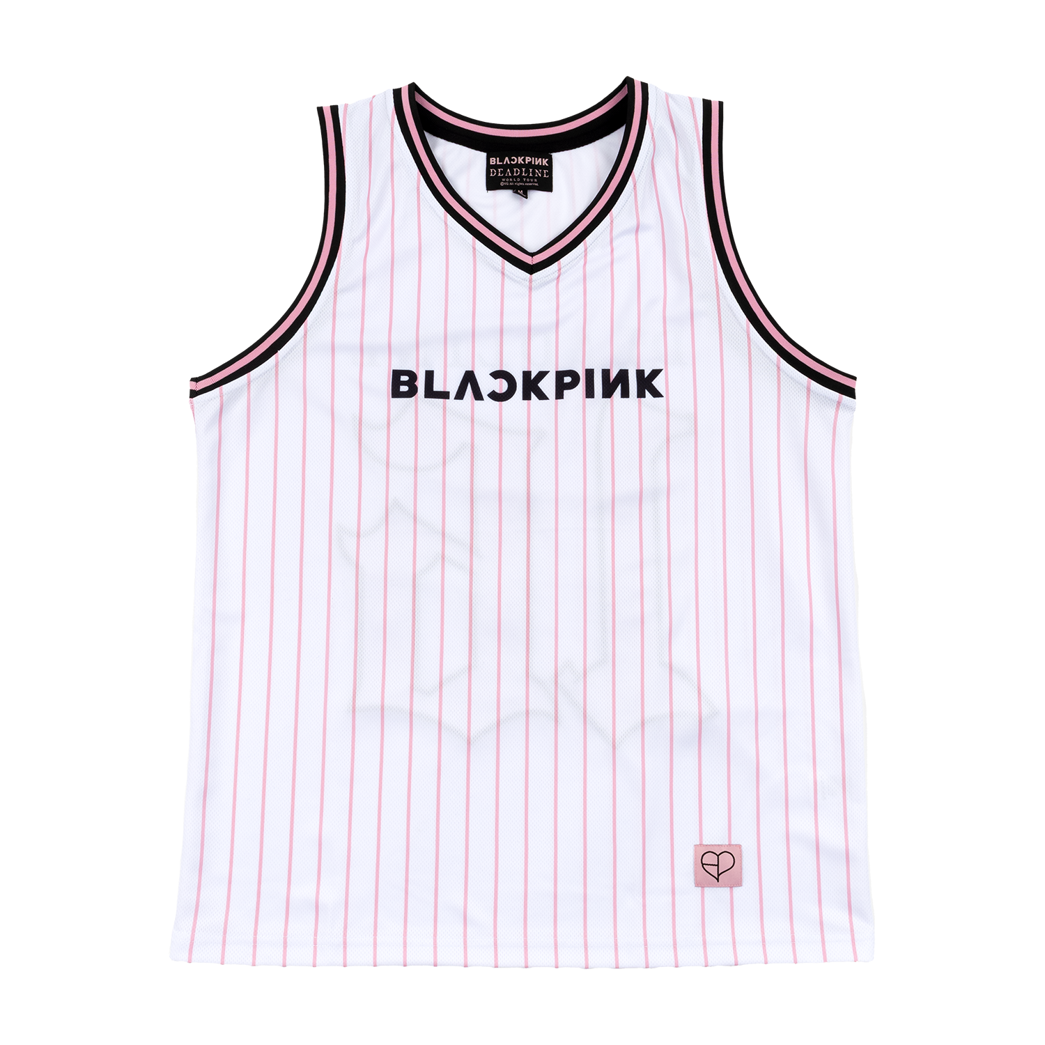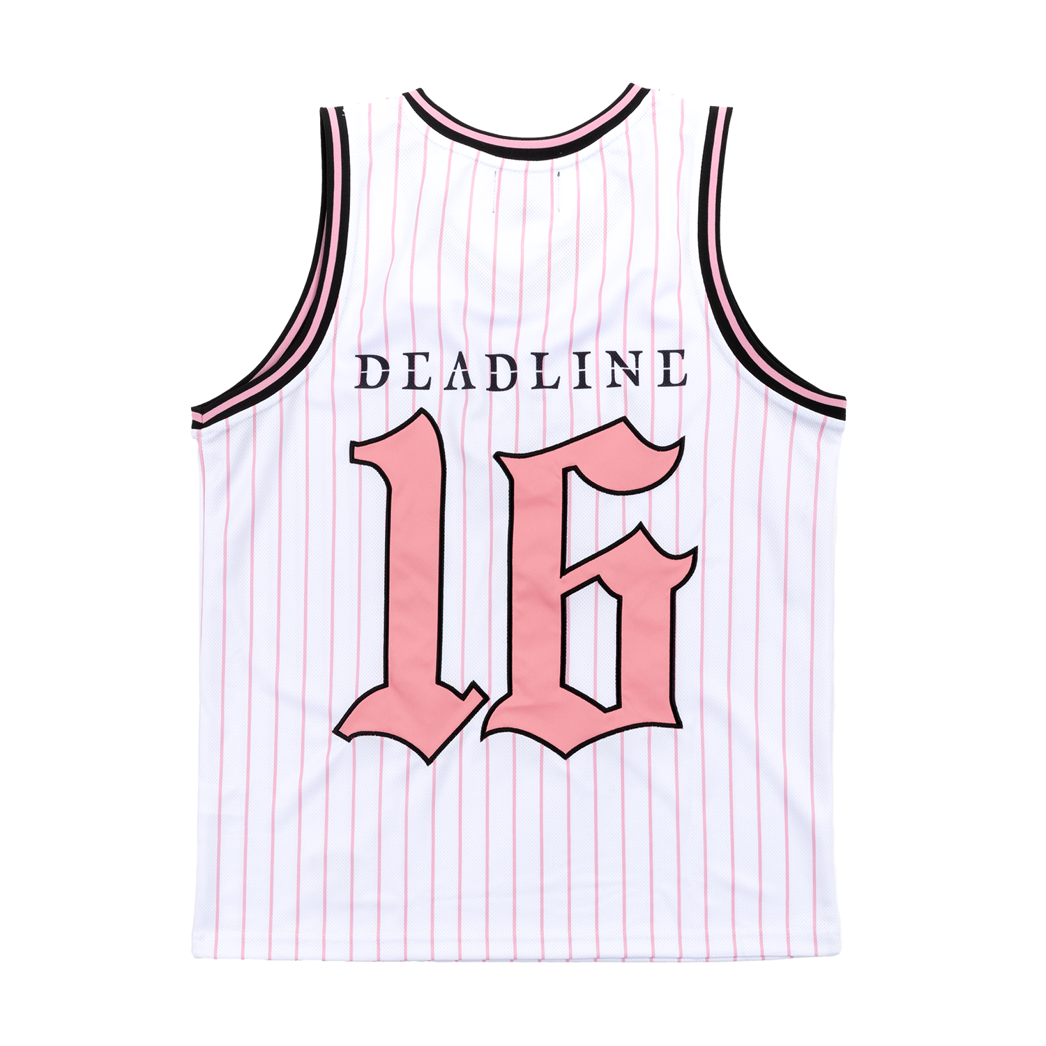 Custom white pinstripe basketball jersey with BLACKPINK on the front and DEADLINE 16 on the back.