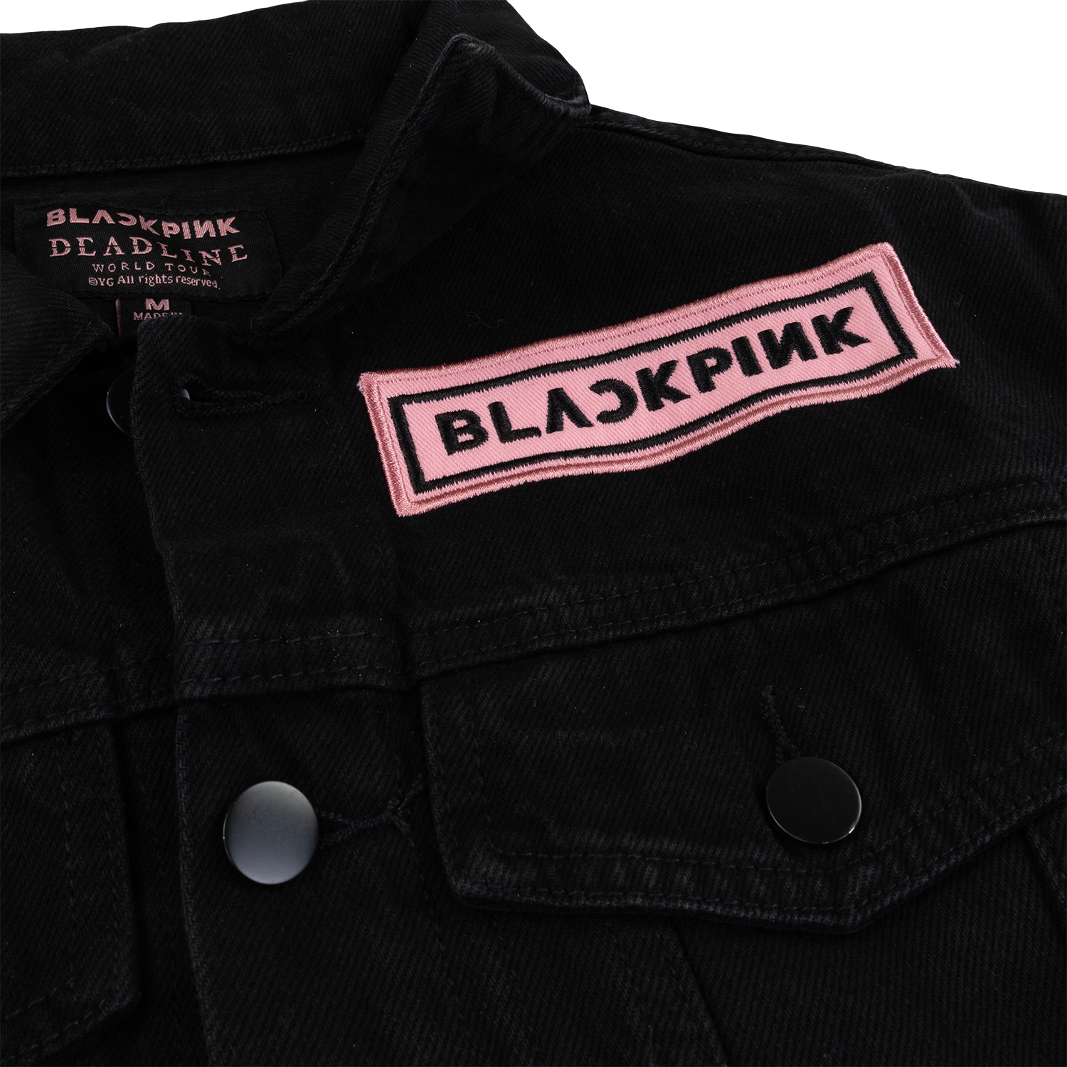 Custom BLACKPINK denim jacket featuring logos in pink on the front and BLACKPINK Deadline World Tour on the back.