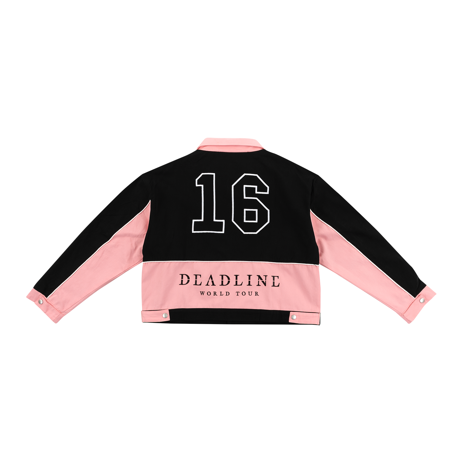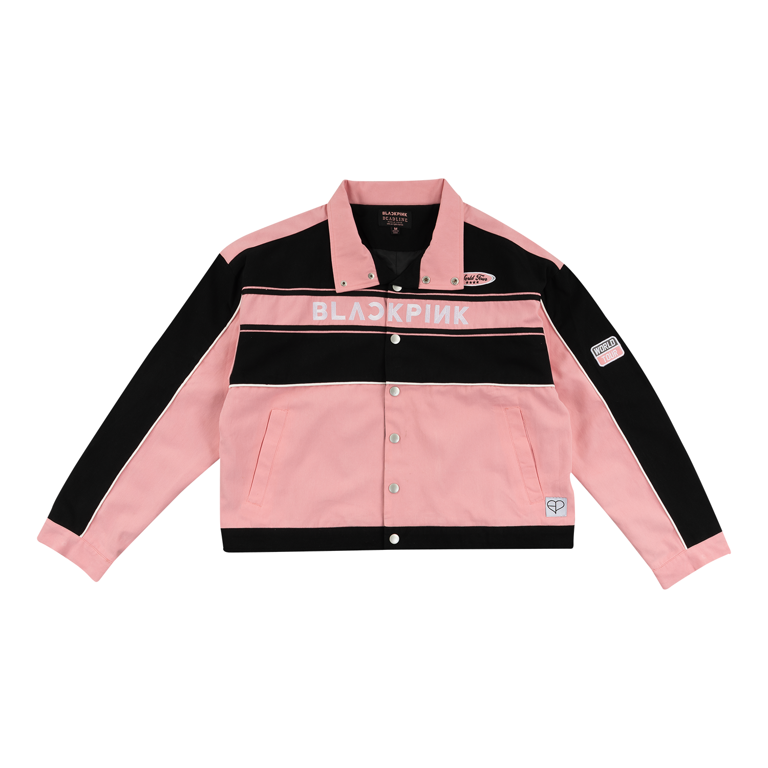 Custom moto jacket in black and pink featuring BLACKPINK on the front, 16 DEADLINE WORLD TOUR on the back, and unique patches on the front and left sleeve.