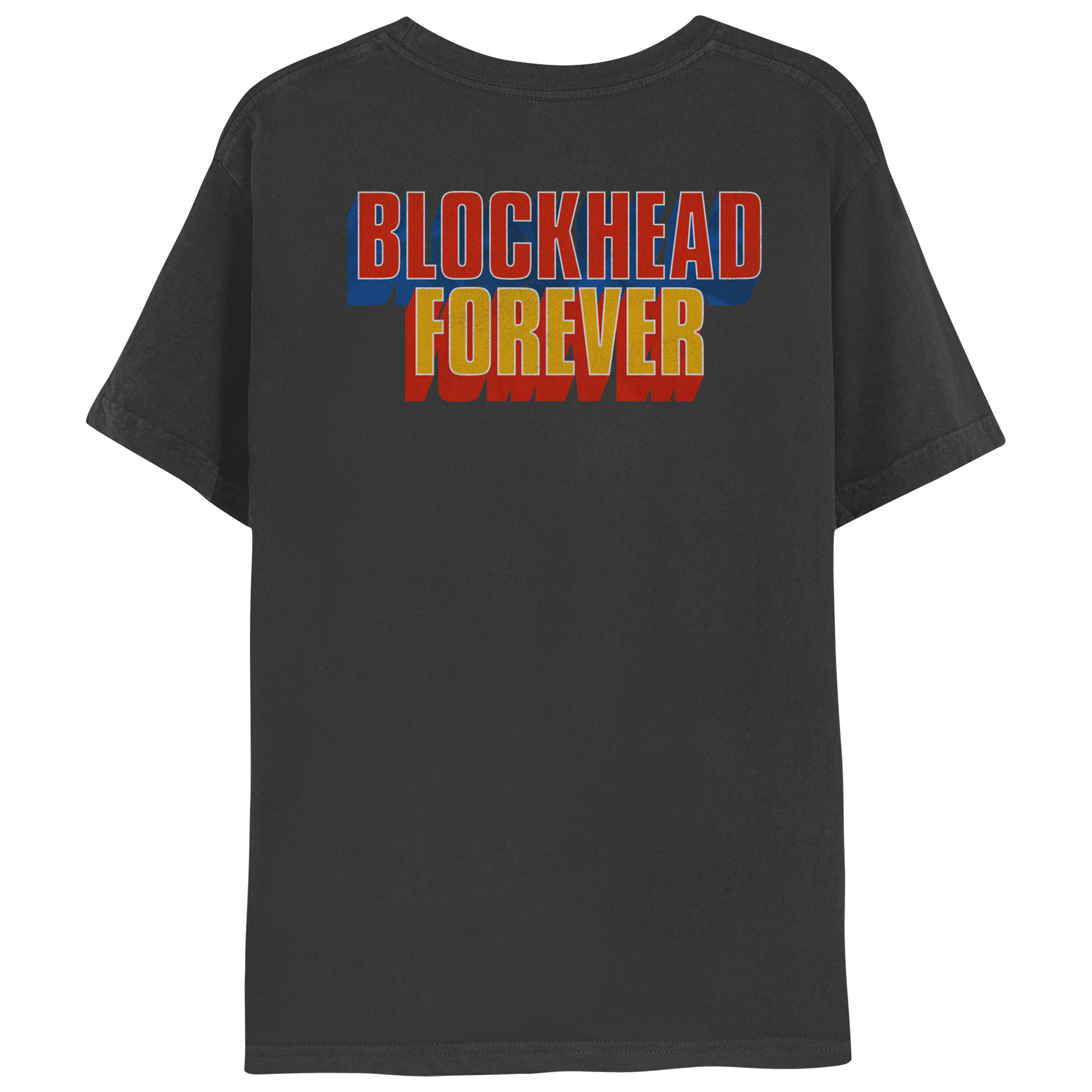 Black 100% cotton short sleeve tee featuring New Kids on the Block classic logo printed on the front and Blockhead Forever printed on the back.