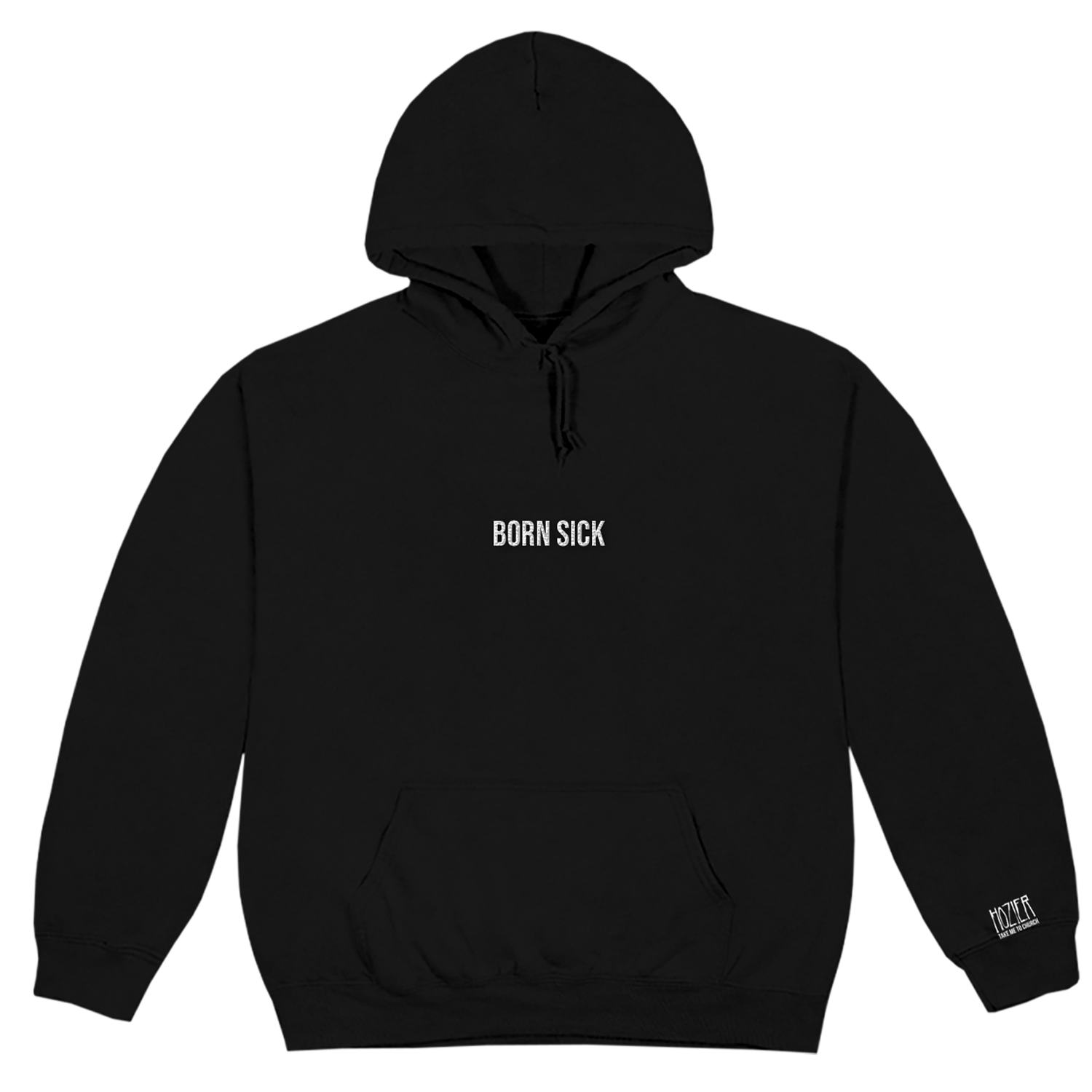 Black hoodie featuring embroidered 'Born Sick' logo artwork on the front and Hozier logo printed on the sleeve.