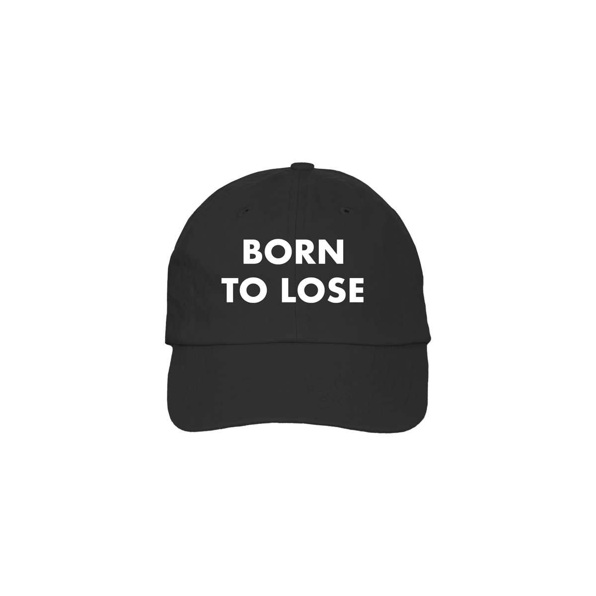 Black dad hat with designs embroidered on the front and back. Features "Born To Lose" graphic from Billy Corgan's "Bat Strat".