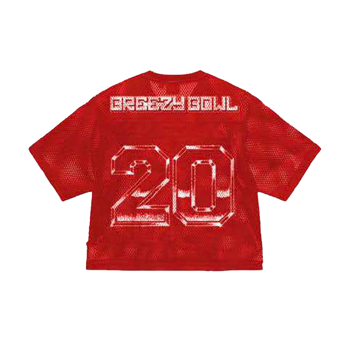 Red mesh football jersey with Breezy Bowl XX Designs on front and back. 240gsm polyester athletic mesh, screenprint front and back, woven neck label.