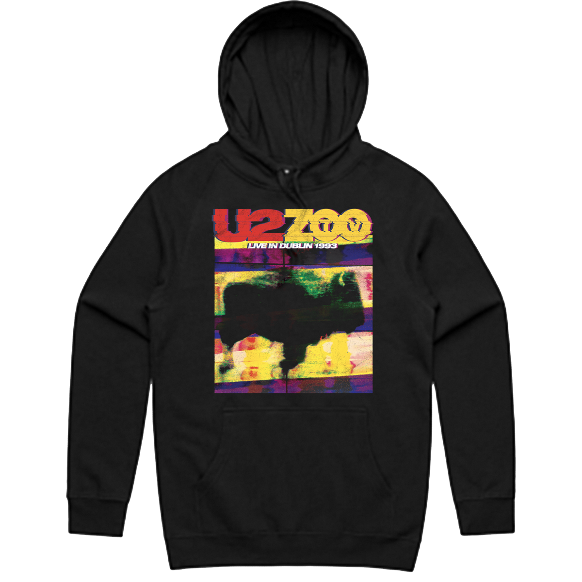 A heavyweight blend hooded sweatshirt in black, featuring a colorful, static-y screen design on the front and a vertical ZOO TV logo on the back.