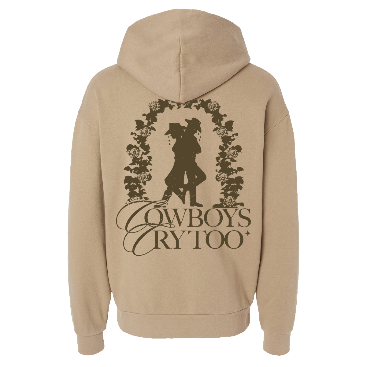 Sand Colored Hoodie featuring Cowboys Cry Too graphic and logo on back, with Kelsea Ballerini logo on front center.