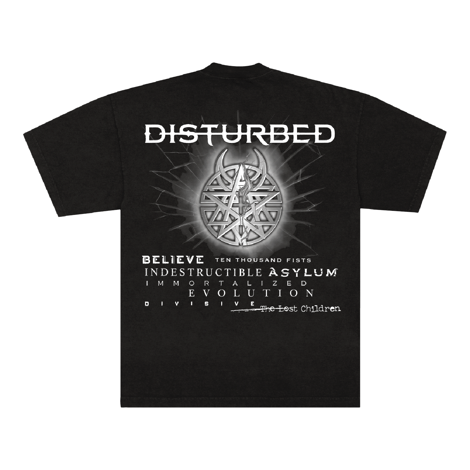 Disturbed album anthology art on front, album titles on back printed on a black tee.