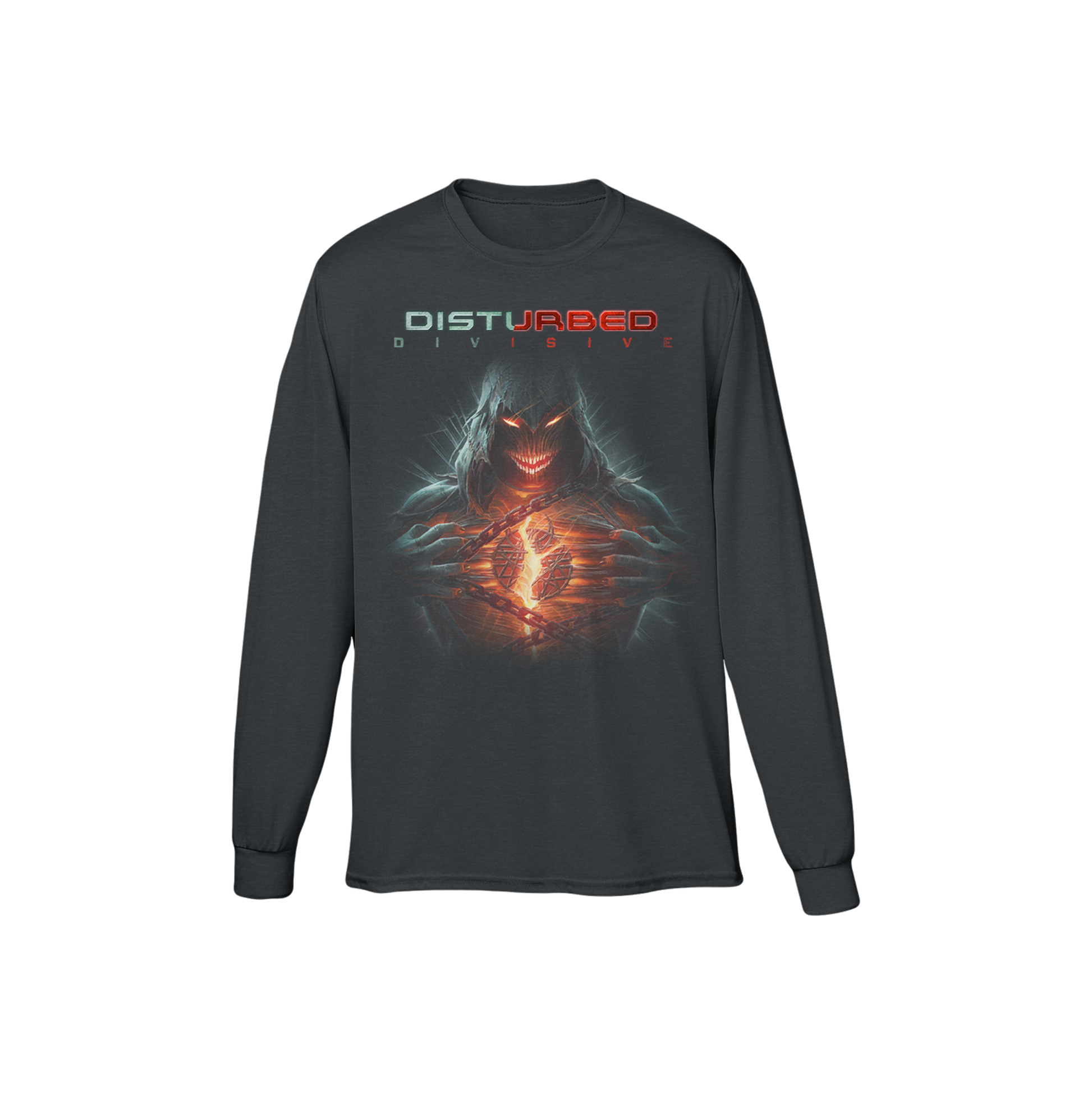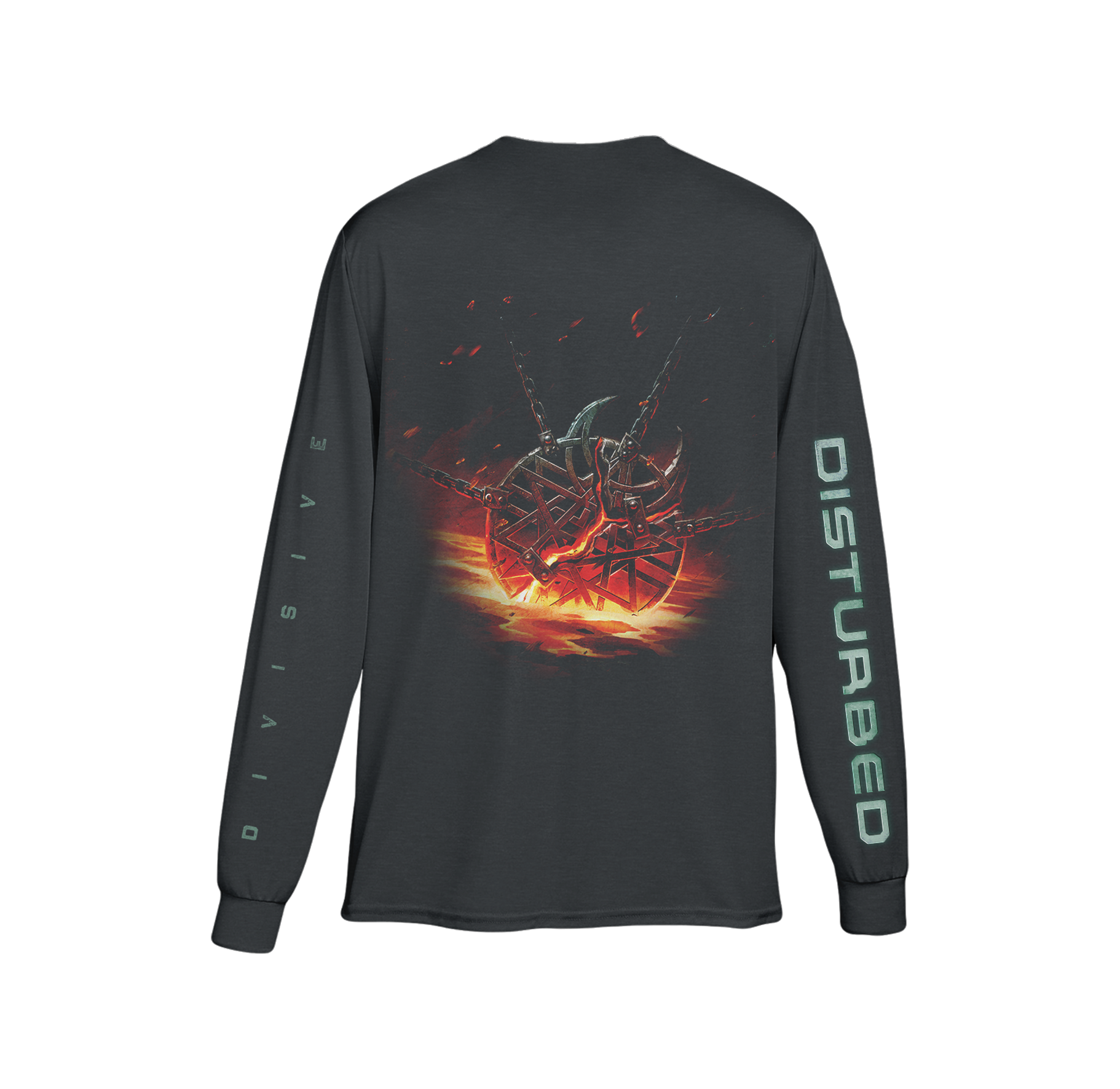Disturbed Divisive logo and graphic on front, Divisive logo on left sleeve, Disturbed logo on right sleeve and chain graphic printed on a black long sleeve tee.
