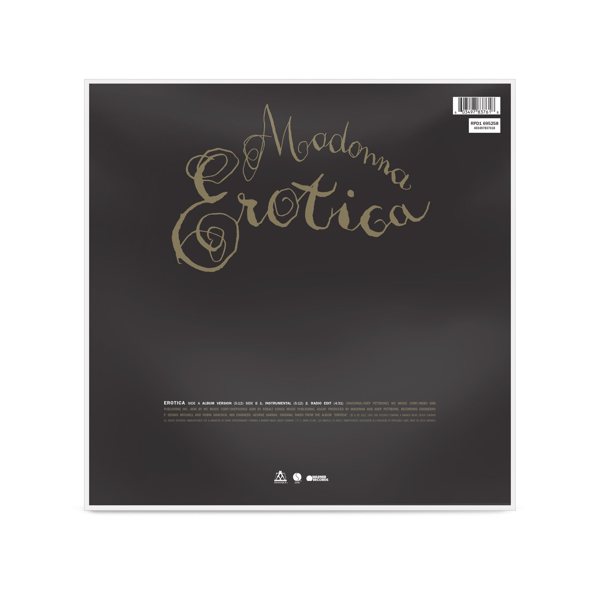 Celebrating the 30th Anniversary of Madonna’s ‘Erotica’ album with the official release of the 1992 cancelled 3-tracks vinyl picture disc. Famous “toe sucking” photo featured on the front and “Madonna Erotica” logo on the back. Comes with a two-sided backer card and transparent PVC sleeve.