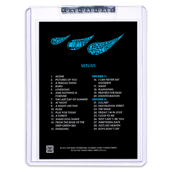 GAS is proud to present the official The Cure Shows Of A Lost World North America Tour 2023 Trading Cards, featuring the poster artwork and setlist from each show. This is the June 25th, 2023, Columbia, MD Merriweather Post Pavilion card with art by Evangeline Gallagher, featuring the concerts setlist on the back.