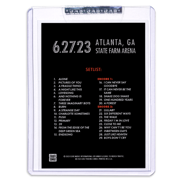 GAS is proud to present the official The Cure Shows Of A Lost World North America Tour 2023 Trading Cards, featuring the poster artwork and setlist from each show. This is the June 27th, 2023, Atlanta, GA State Farm Arena card with art by Christopher Everhart, featuring the concerts setlist on the back.