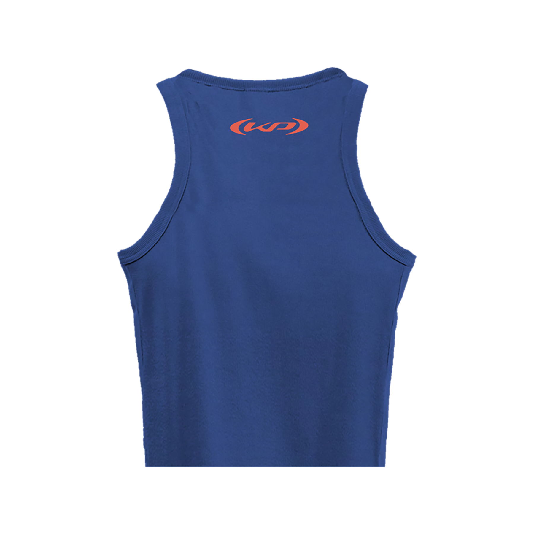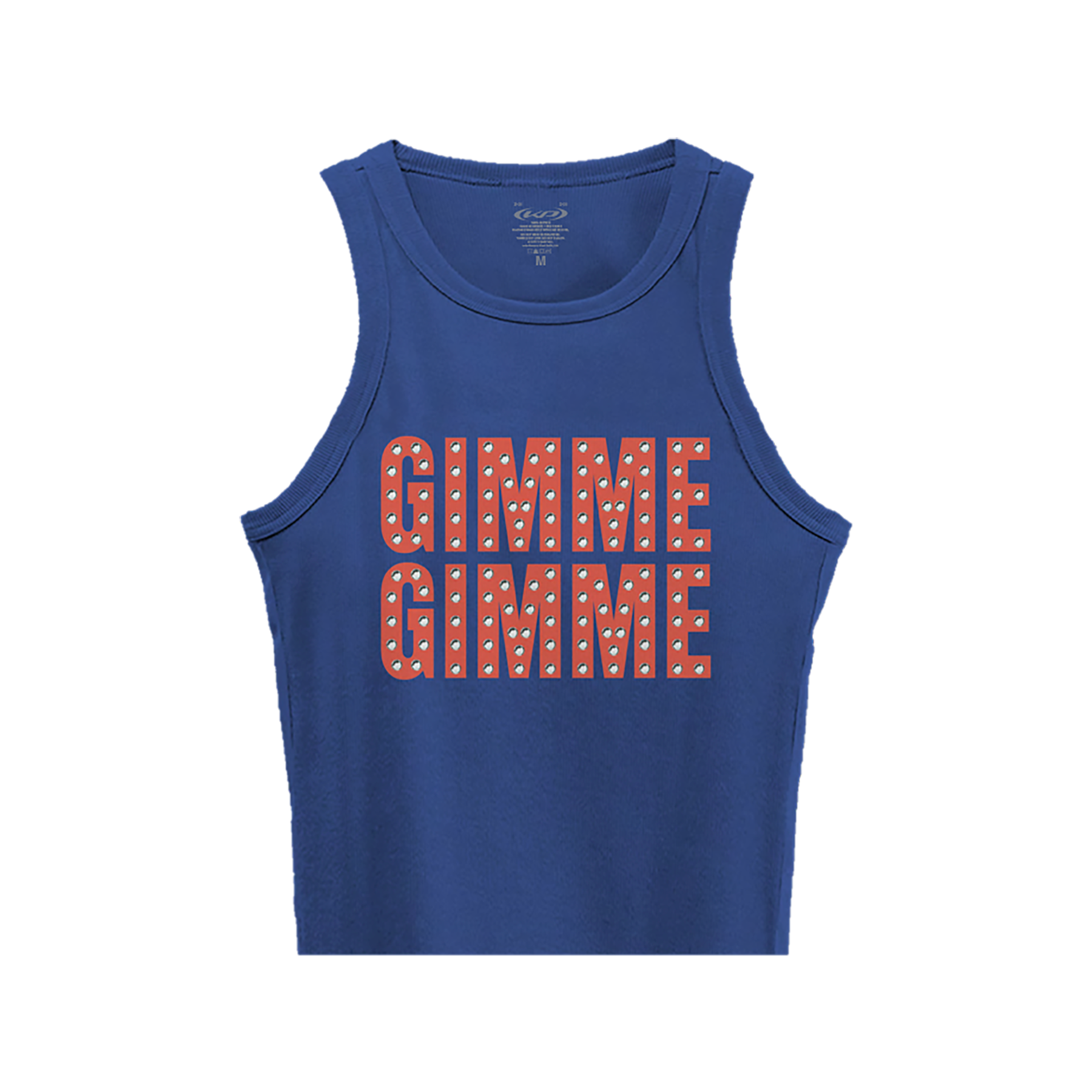 Purple women's cropped tank top featuring GIMME GIMME printed on the front with rhinestones and the KP logo printed on the back.