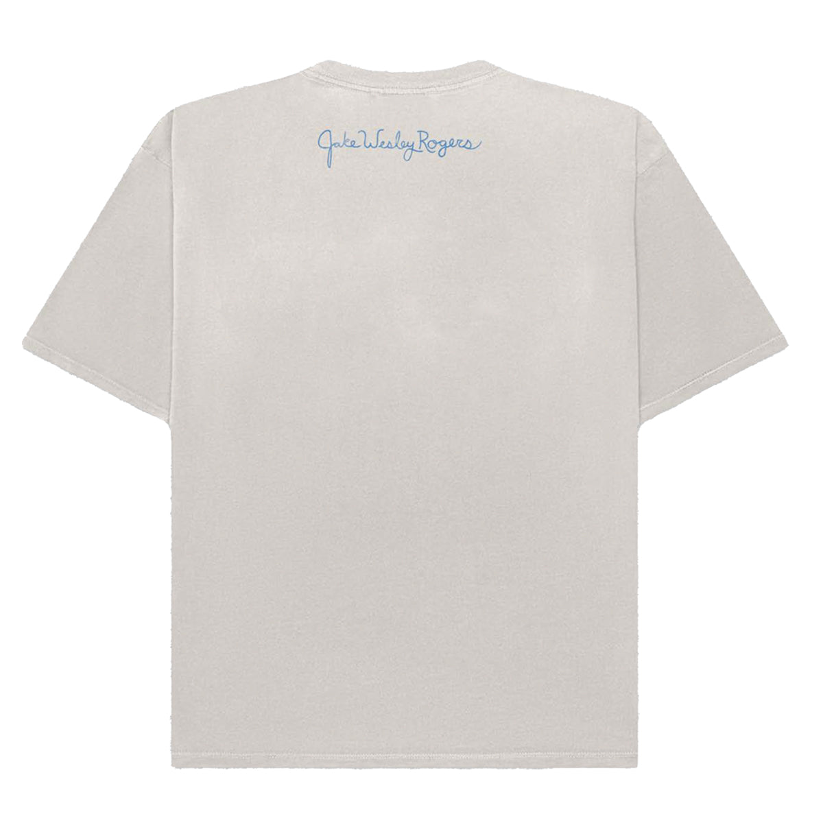 "God Bless the Trans Kid in Texas" on front, Jake Wesley Rogers logo on back printed on a white tee.