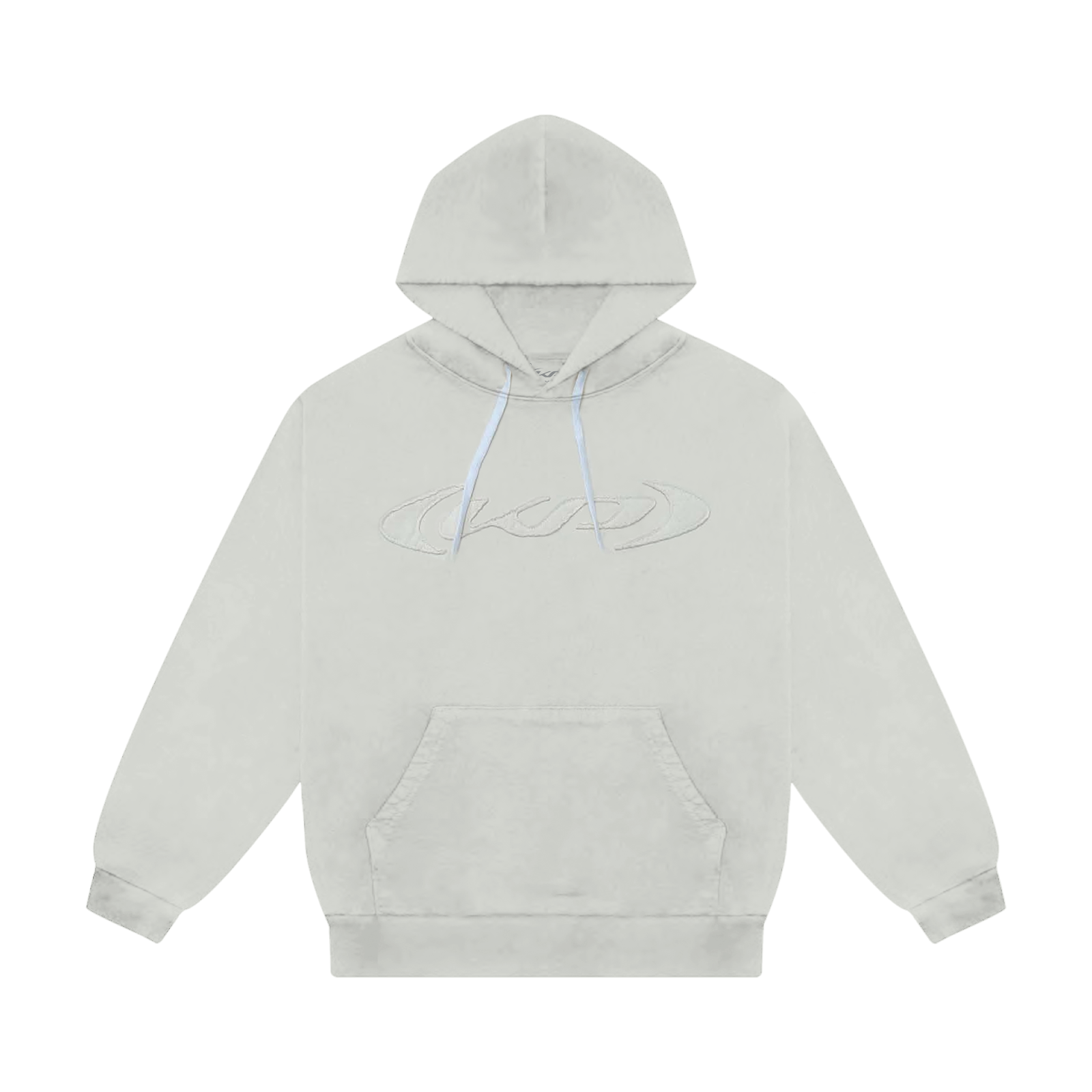 Off-white pullover hoodie with an embossed (KP) logo on the front.