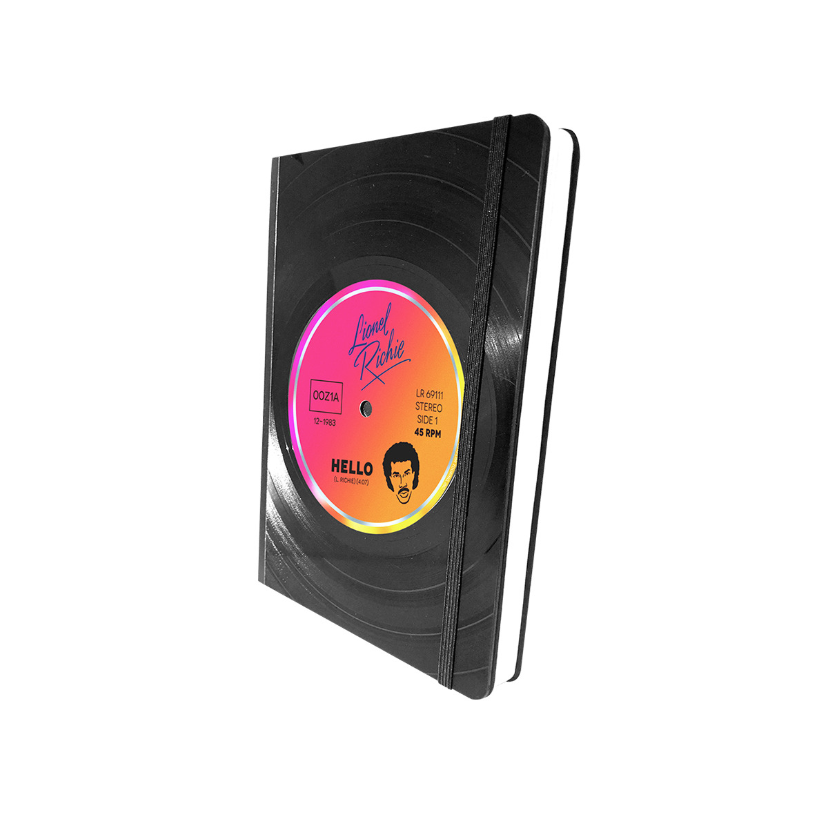 Lionel Richie Vinyl record notebook. Featuring 100 sheets of lined paper and an elastic band closure, these notebooks are useful, convenient, and super cool.
