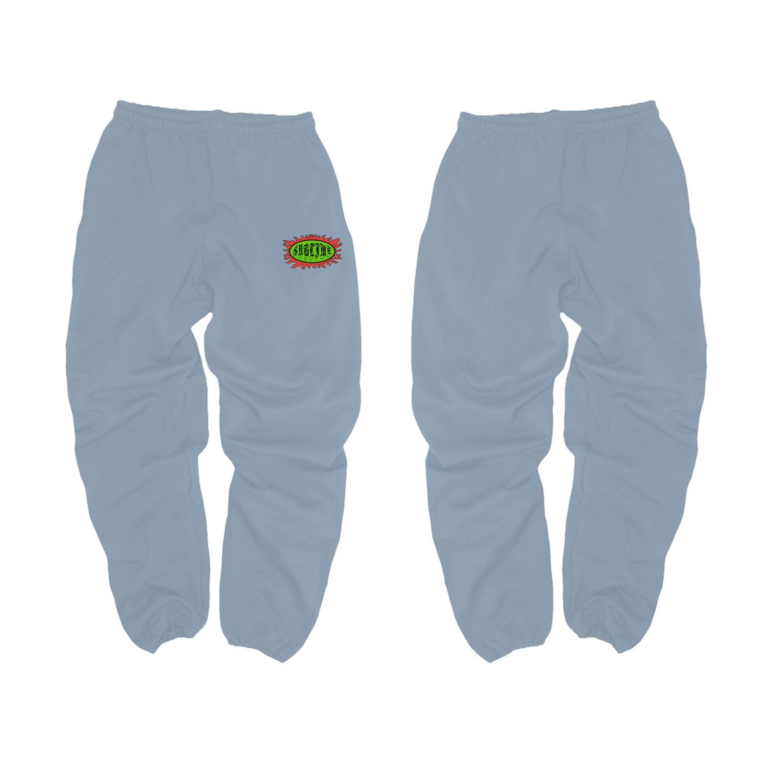 Classic fitting unisex sweatpants in stone blue featuring a Sublime sun logo printed on the lower left leg.