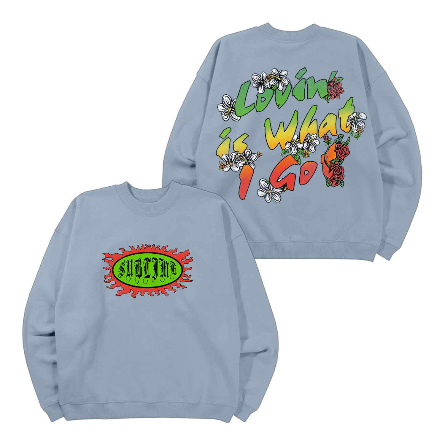 Classic fitting unisex sweatshirt in stone blue featuring a Sublime logo sun printed on the front and a Love Is What I got design on the back.