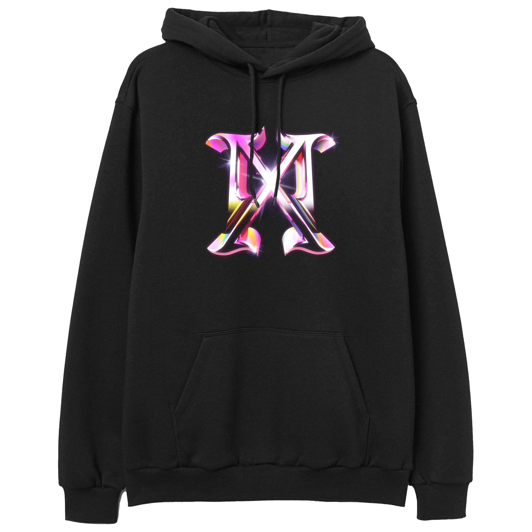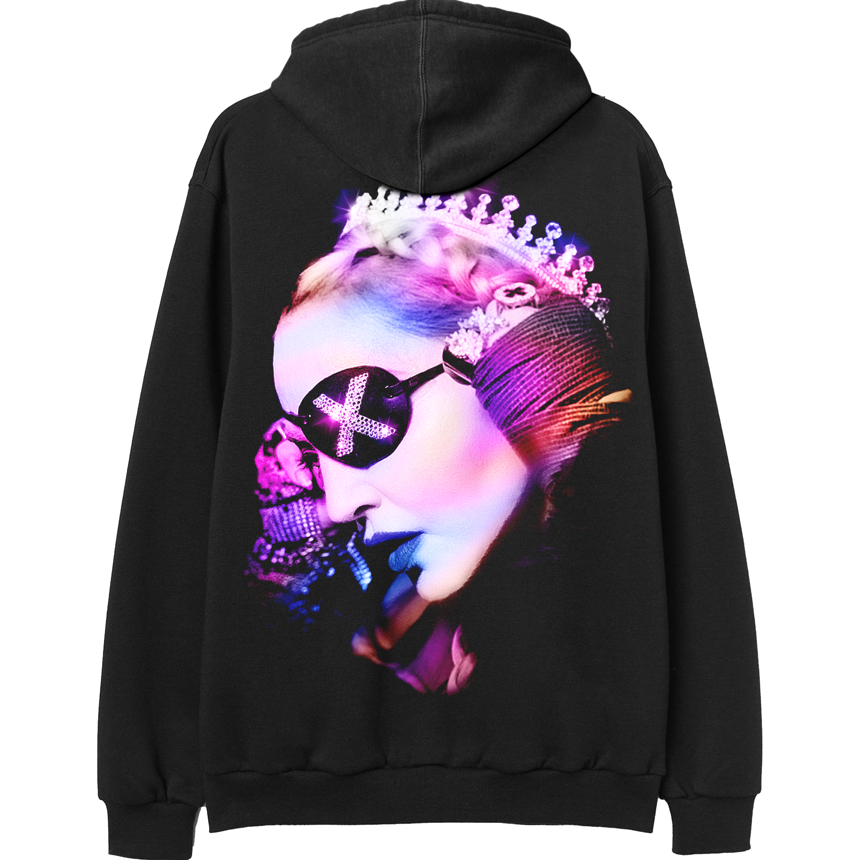 Black Fleece Pullover Hoodie featuring MX Logo is printed on the front with Madonna Crown photo artwork printed on the back