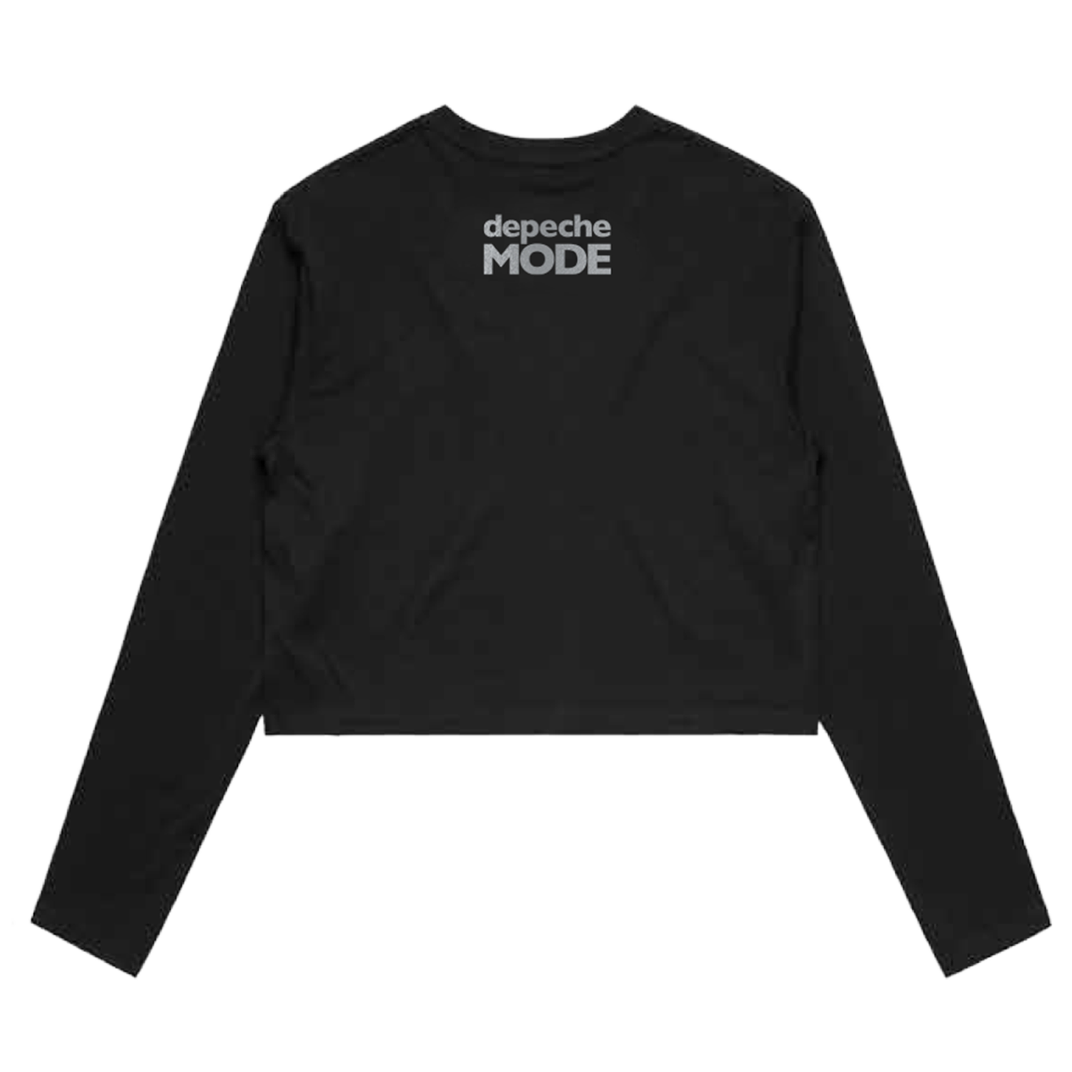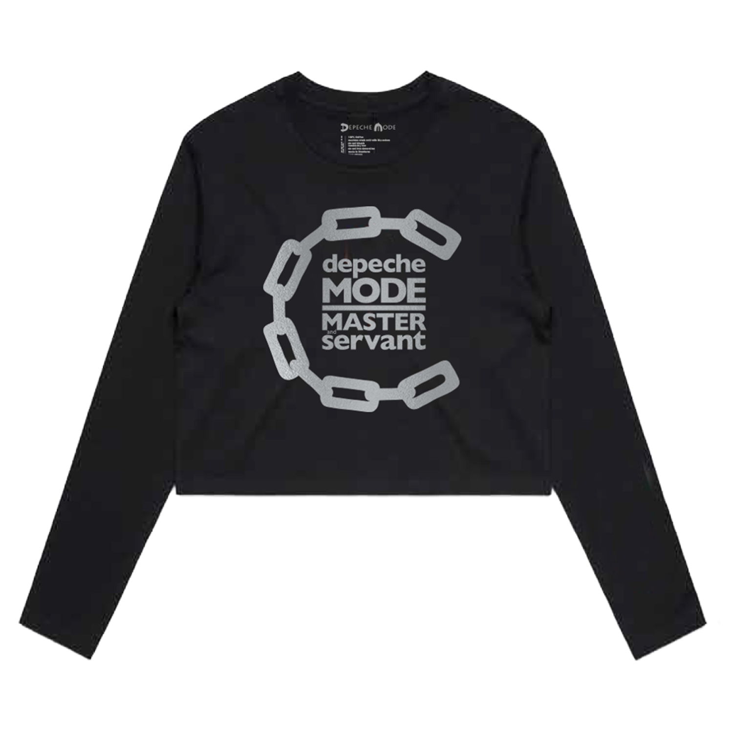 This women's crop crewneck sweatshirt features the Depeche Mode "Master and Servant" design printed on the front, and Depeche Mode logo on the back, all in silver metallic ink.