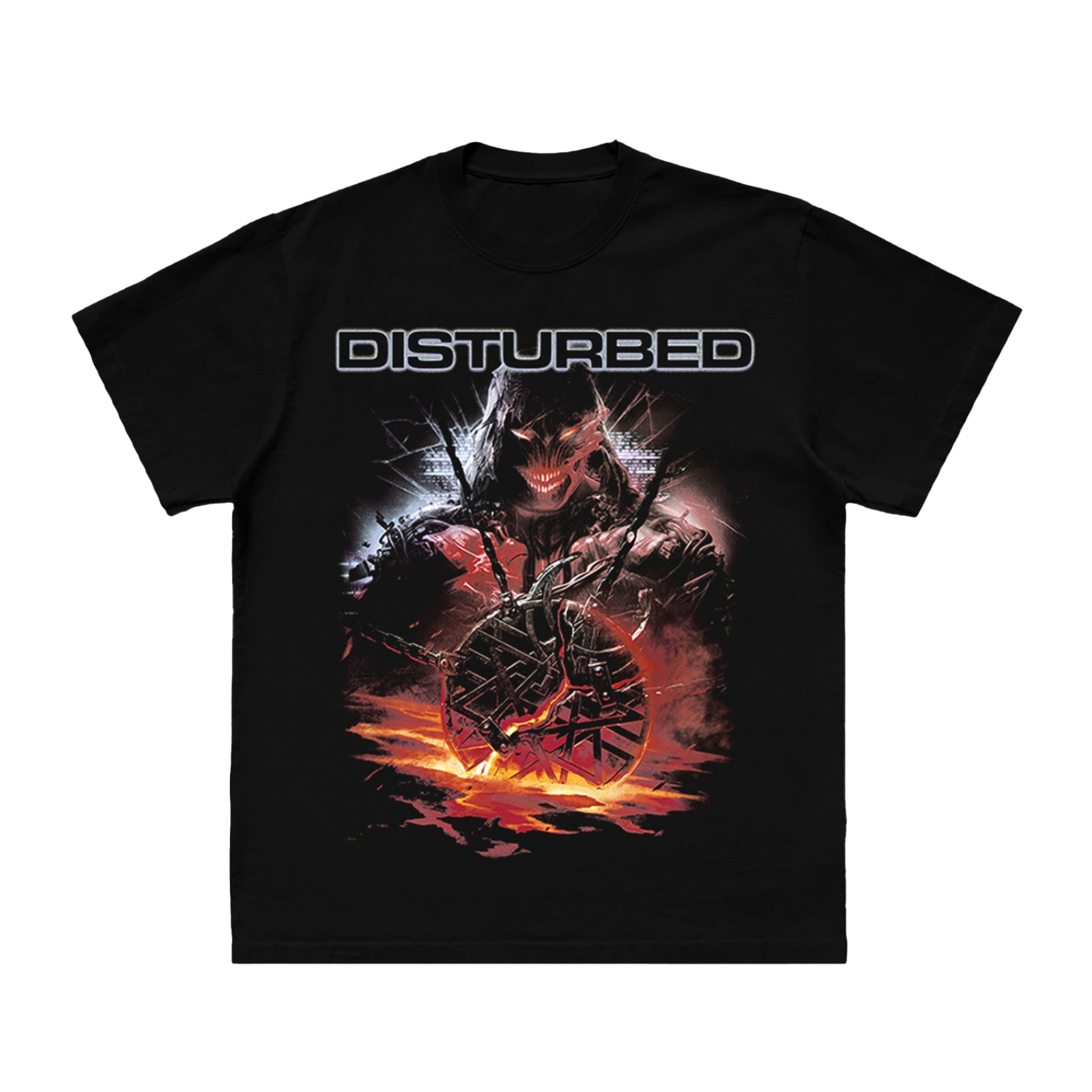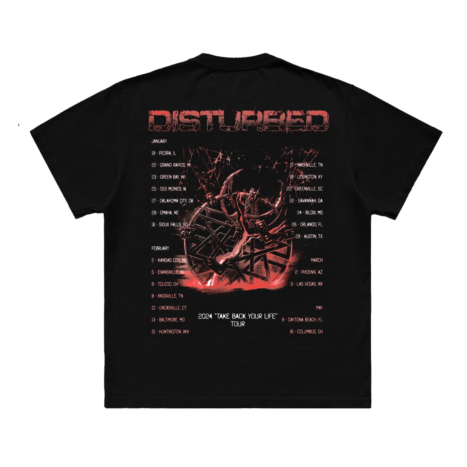 Disturbed The Guy graphic on front, tour cities and dates on back printed on a black tee.