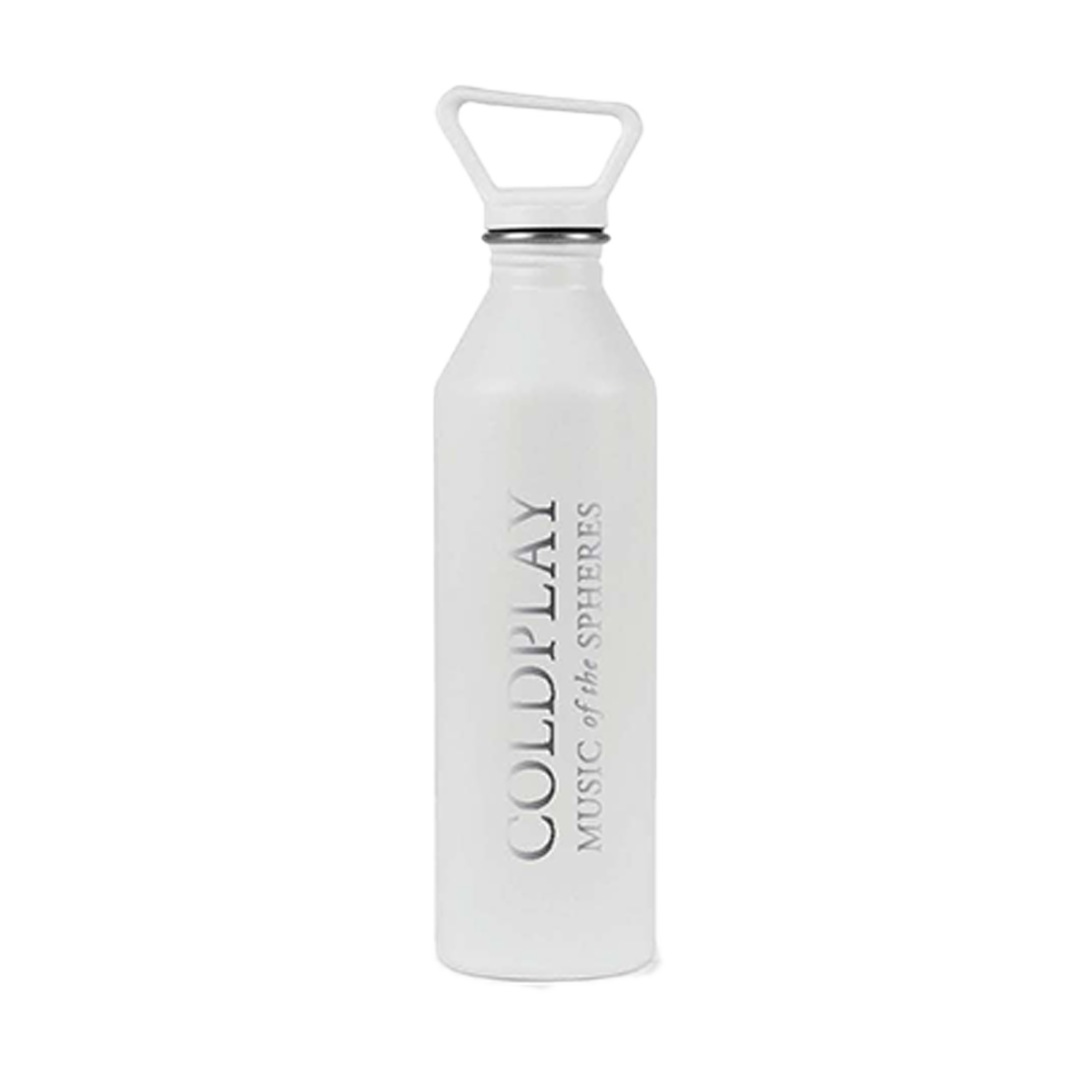 Coldplay, Music of the Spheres laser etched on a white sustainable stainless steel water bottle made by MiiR, a climate neutral B-corporation. 27 oz.