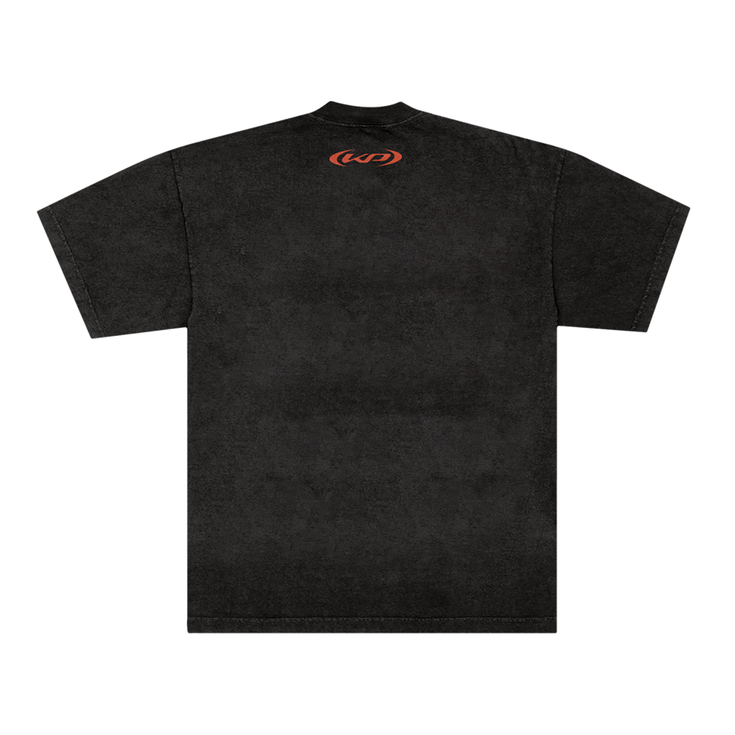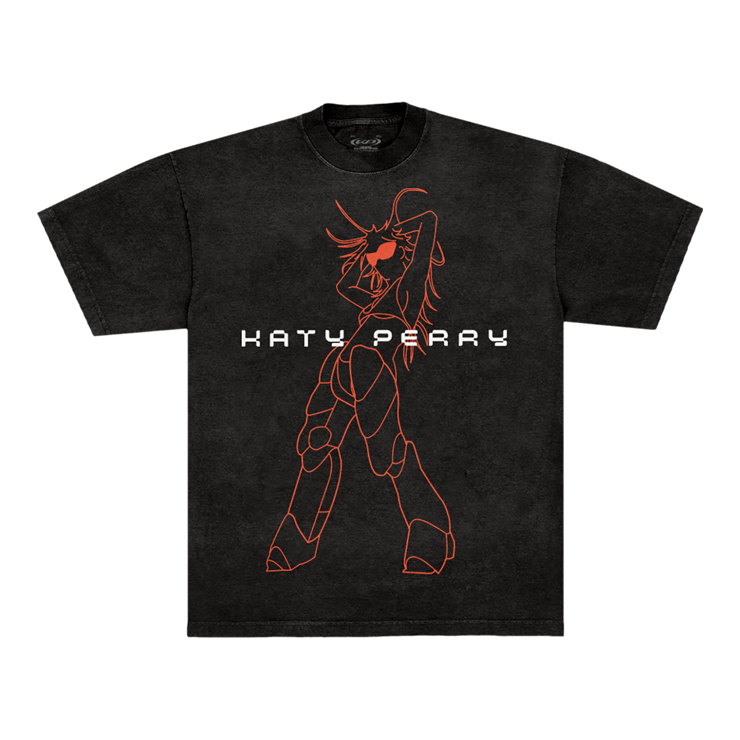 Vintage wash black t-shirt featuring a cartoon take on Katy Perry's iconic "Woman's World" look.