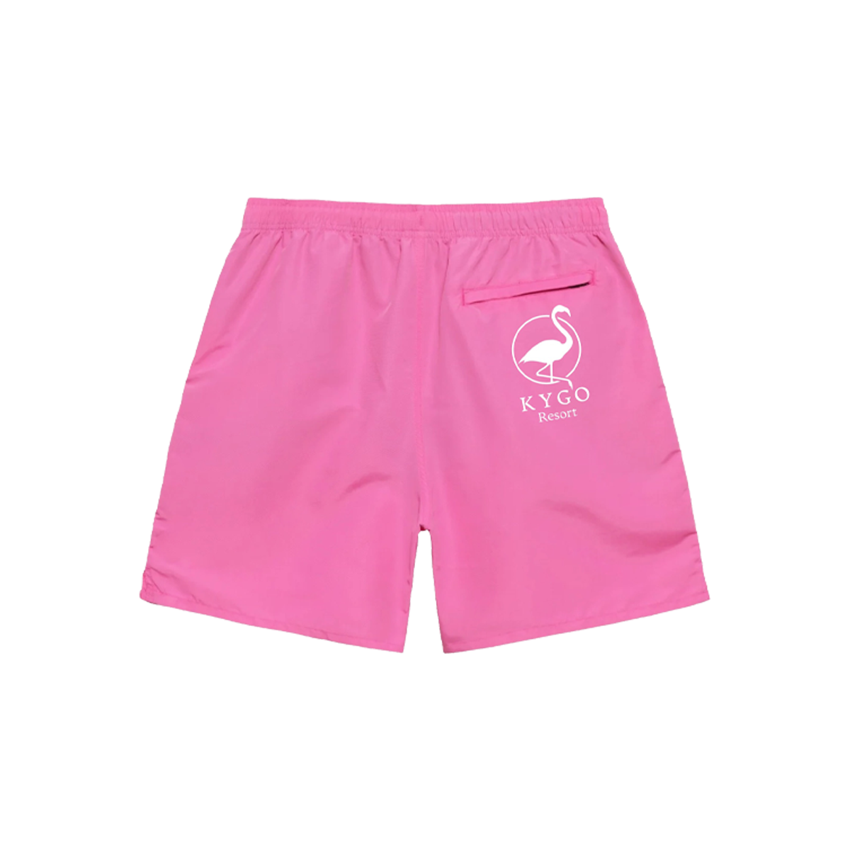 Pink swim trunks with designs printed on both sides.