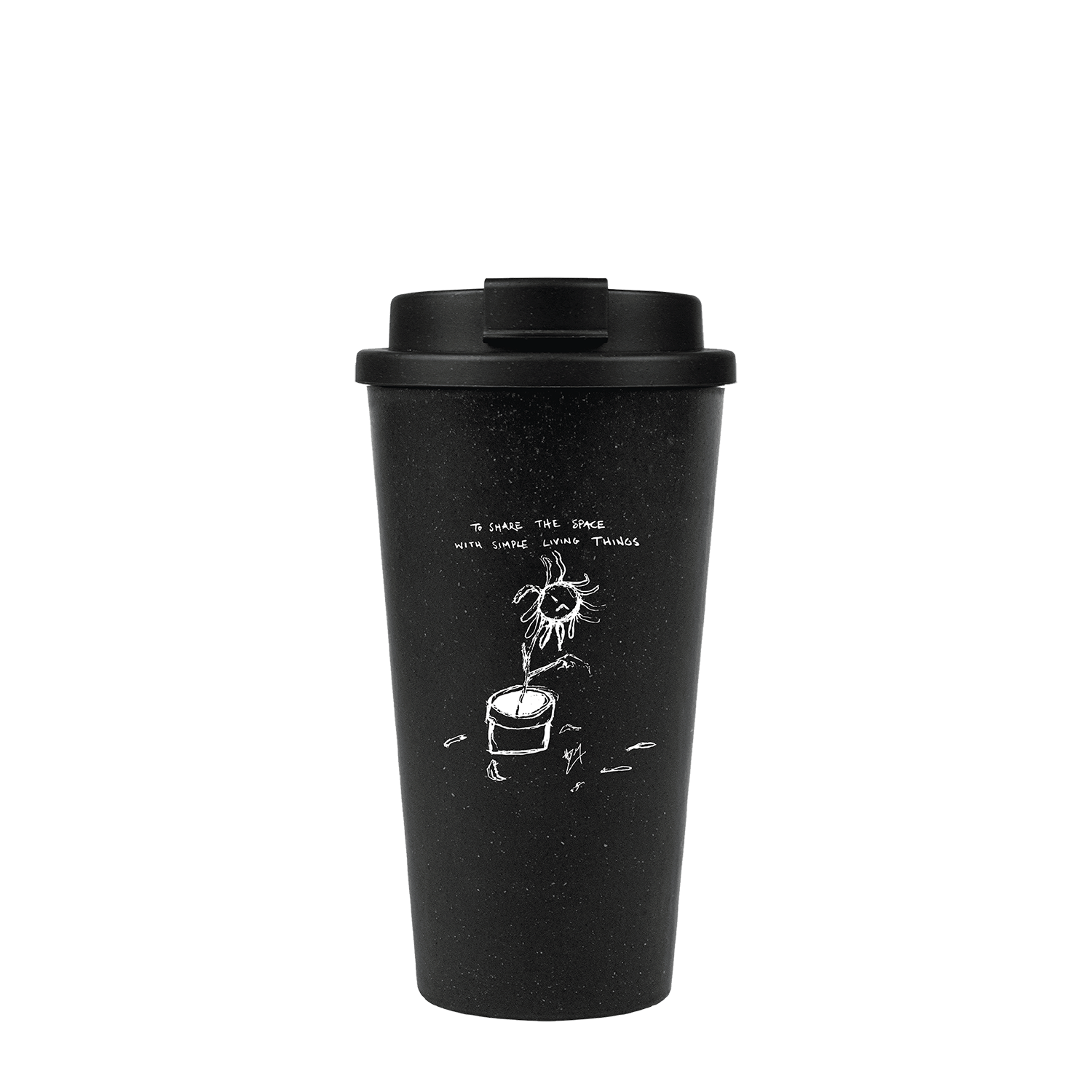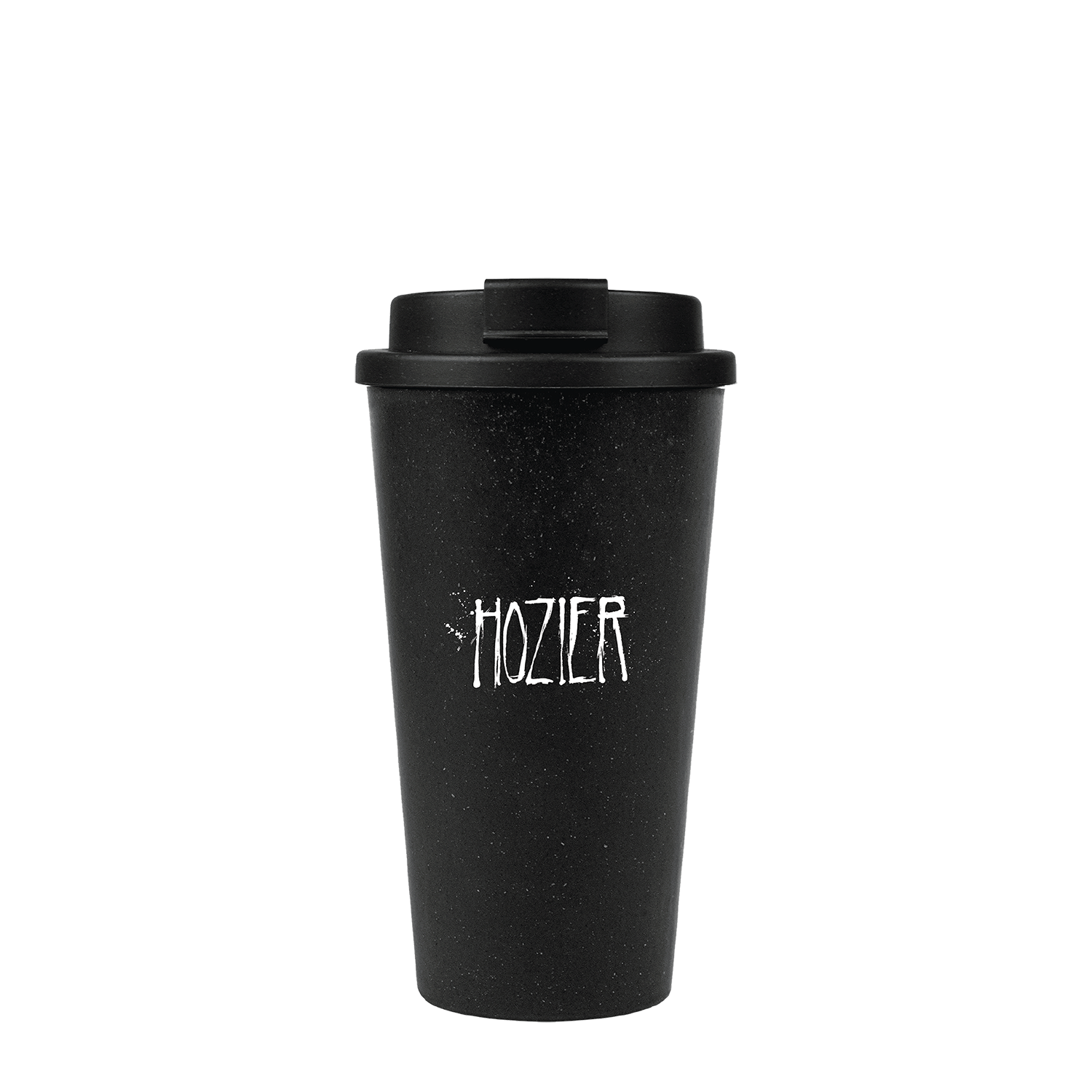 Black reusable cup with Hozier logo on one side and daisy hand drawn artwork on the opposite side. Original art by Hozier.