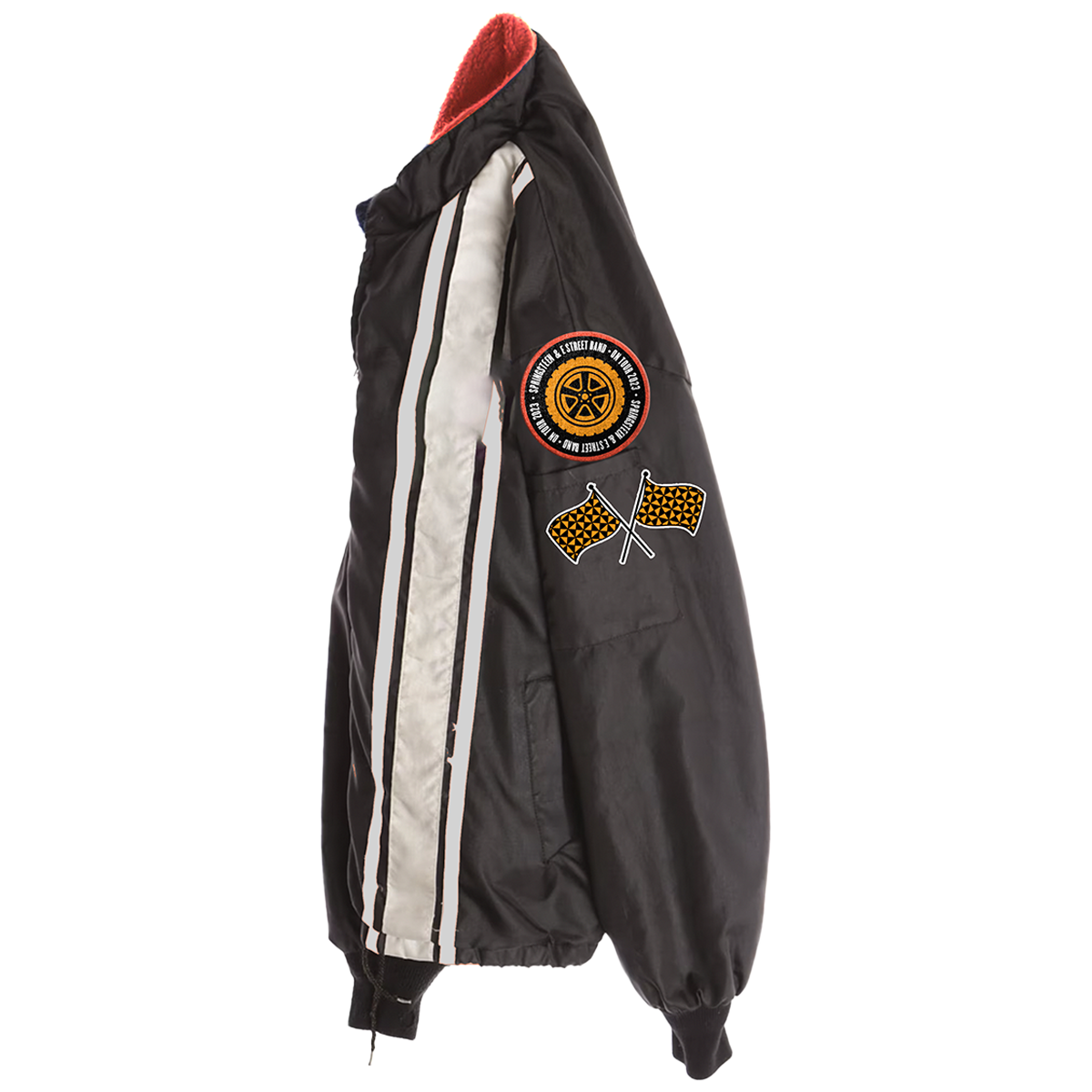 This black bomber jacket features Springsteen and E Street Band stitched on the front chest in red and racing flag design on the arm stitched in yellow.