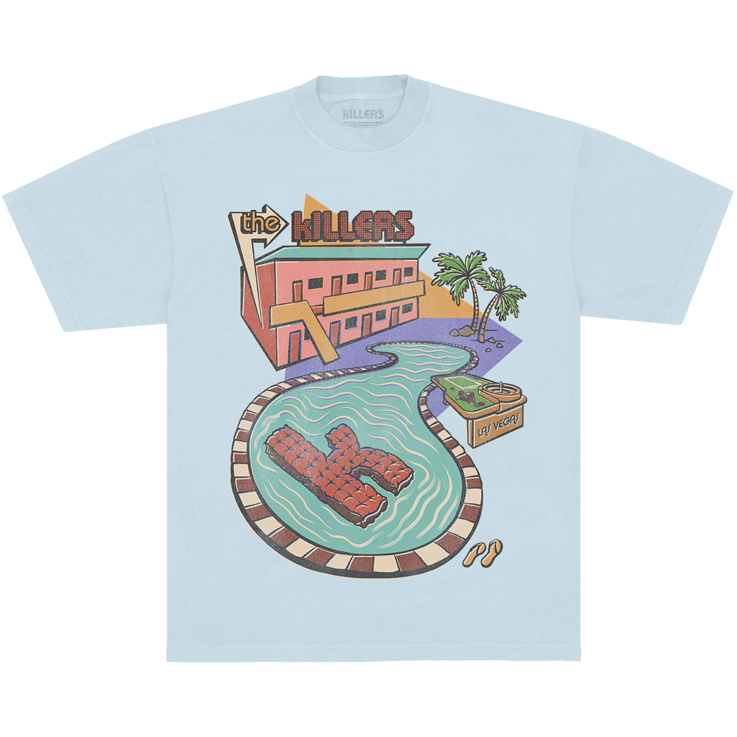 A chambray unisex tee with The Killers motel pool graphic printed on the front.