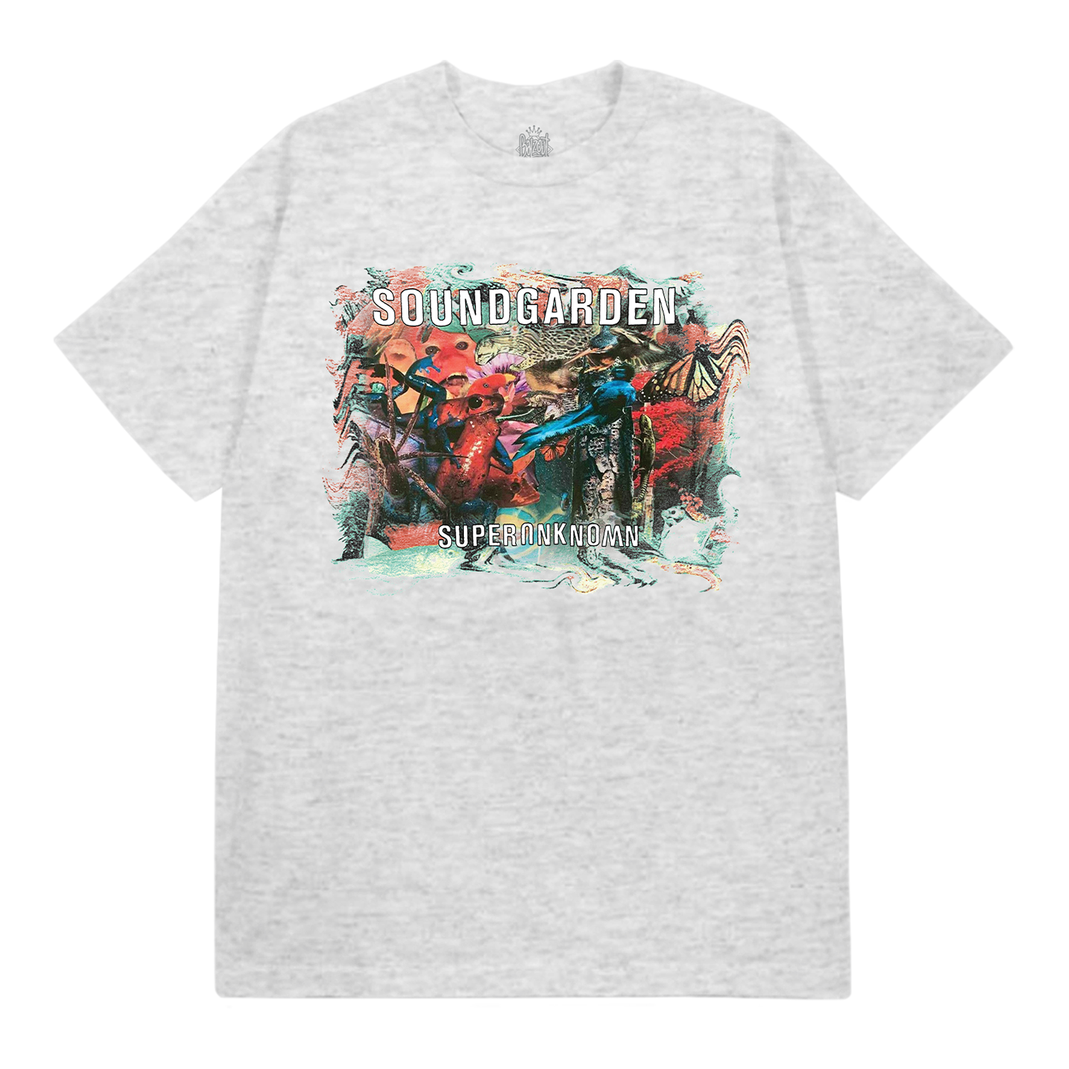 Superunknown collage art on front, Soundgarden logo on back printed on an ash grey Gildan heavyweight tee.