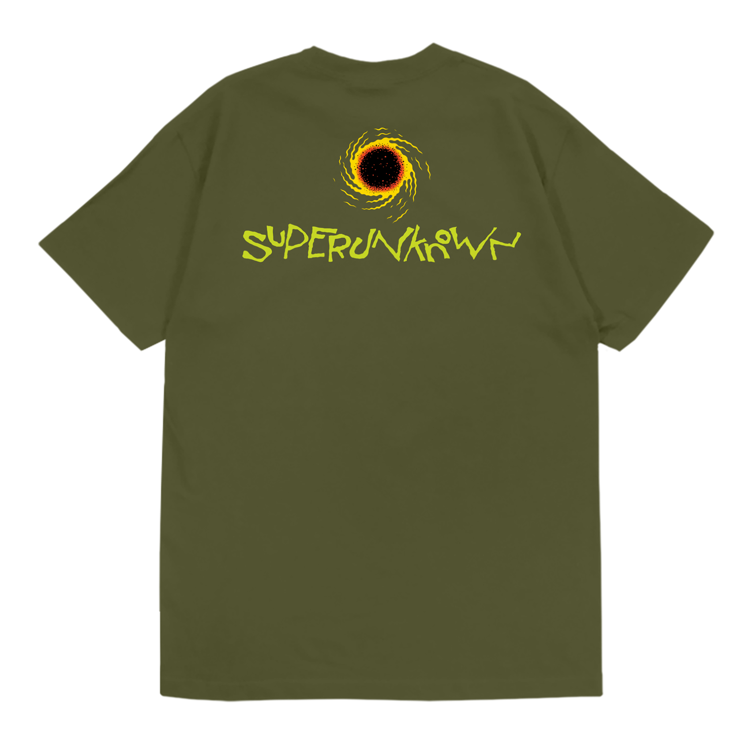 Superunknown graphic on front with logo on back printed on military green Gildan heavyweight tee. Art by Ryan Besch.