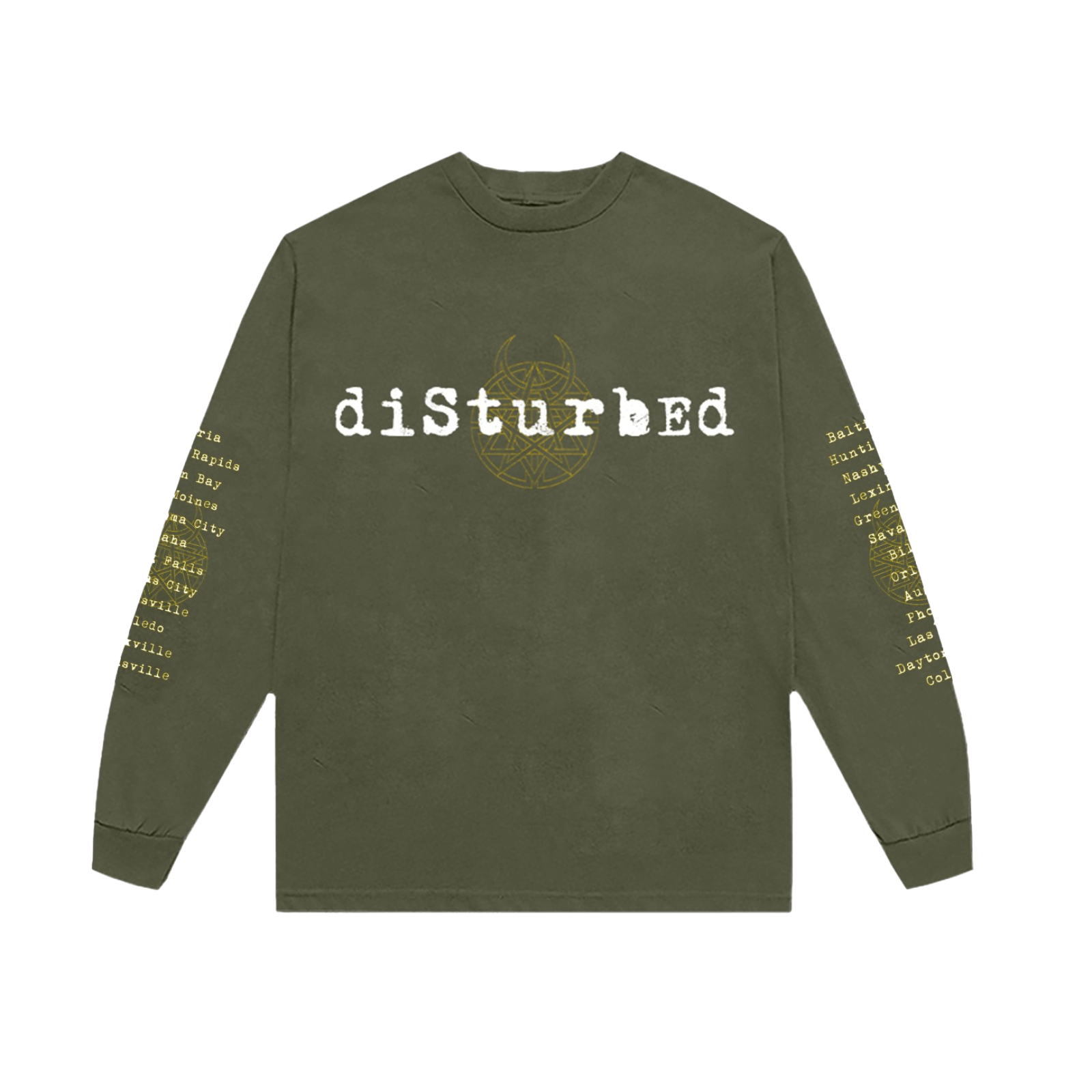Disturbed logo on front, tour cities on sleeves, take back your life logo on back printed on a green long sleeve tee.