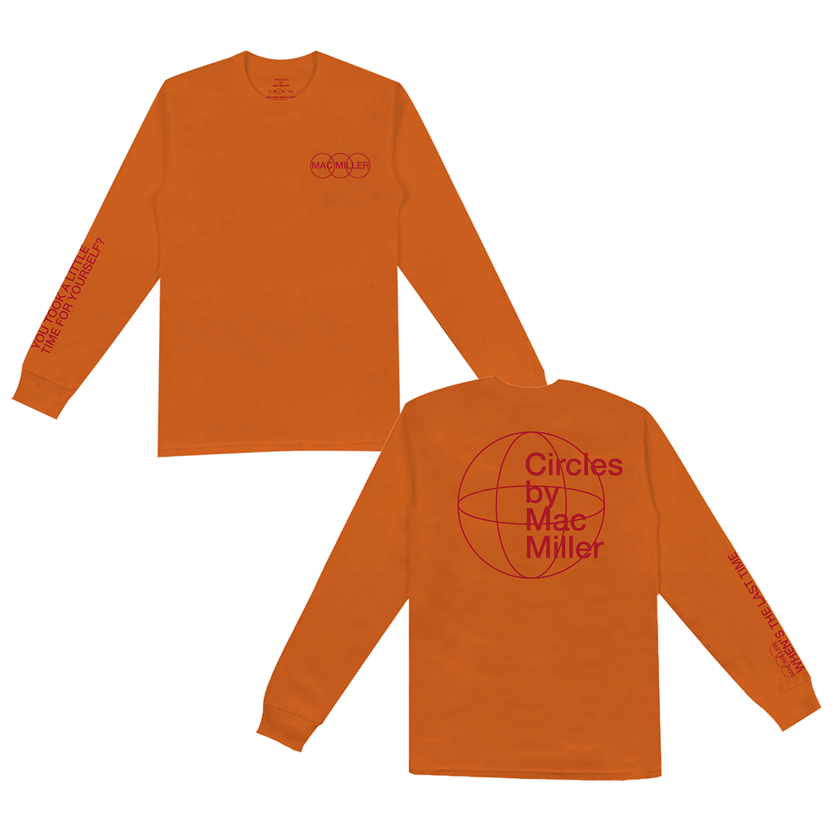 Circles designs printed on the front left, back and right sleeve of an orange unisex long sleeve tee.