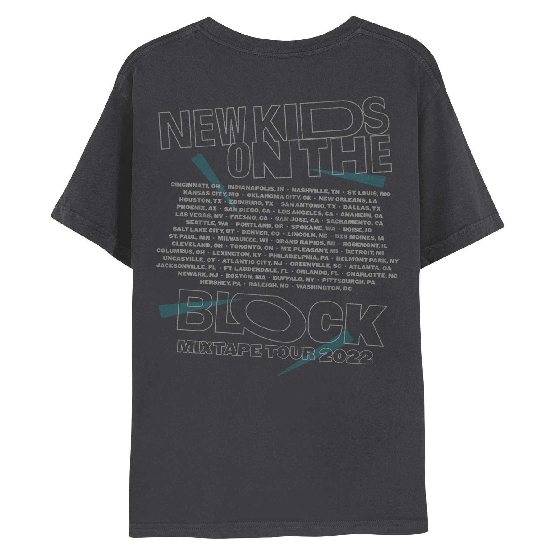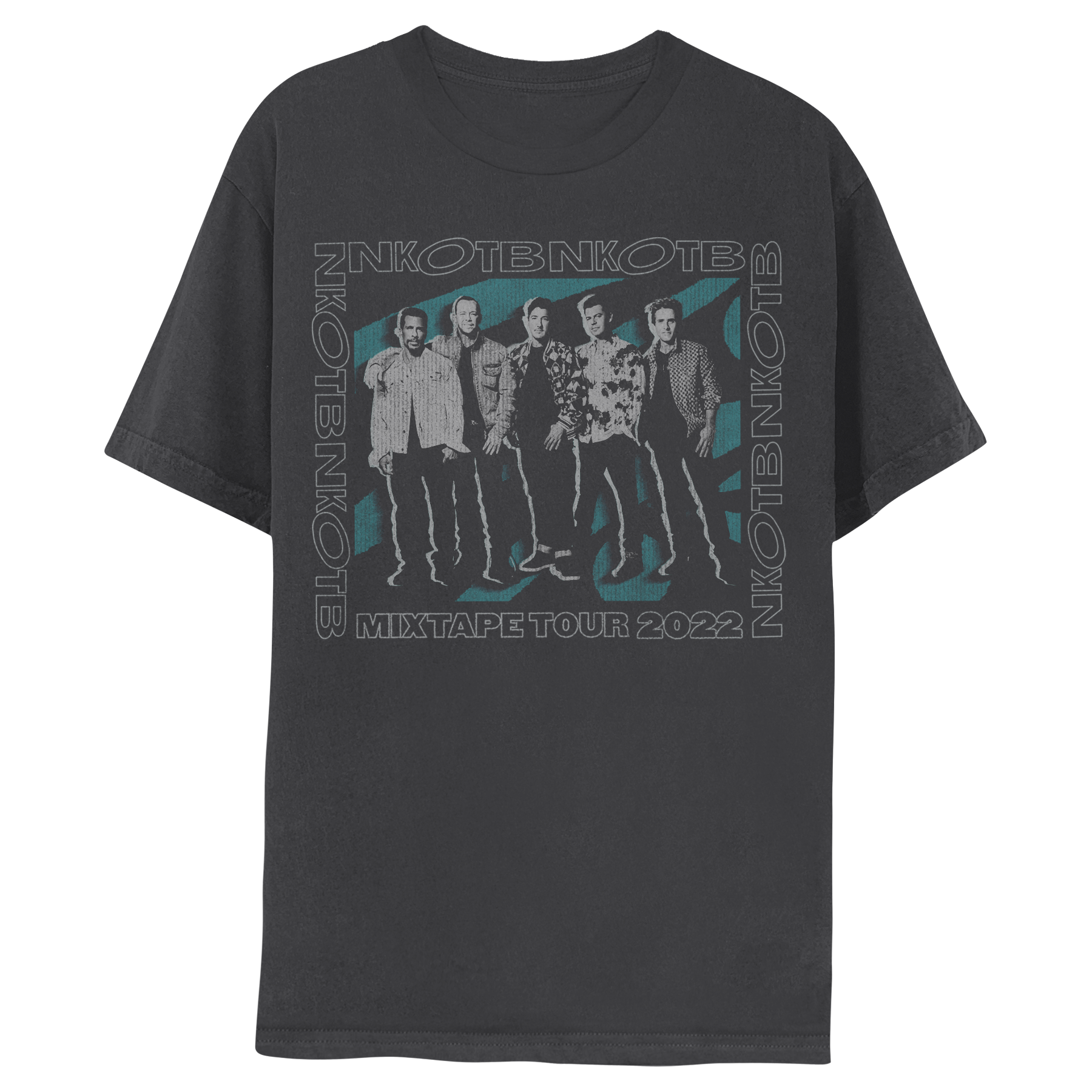 Coal 100% cotton short sleeve tee featuring NKOTB photo artwork on the front and Mixtape Tour 2022 Event cities on the back