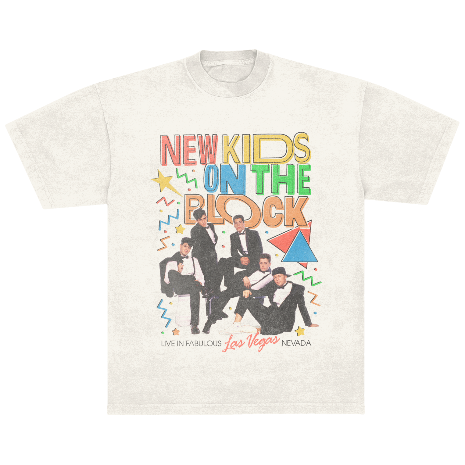 Ivory 100% cotton short sleeve tee with NEW KIDS ON THE BLOCK vintage photo artwork on the front and The Right Stuff event dates on the back