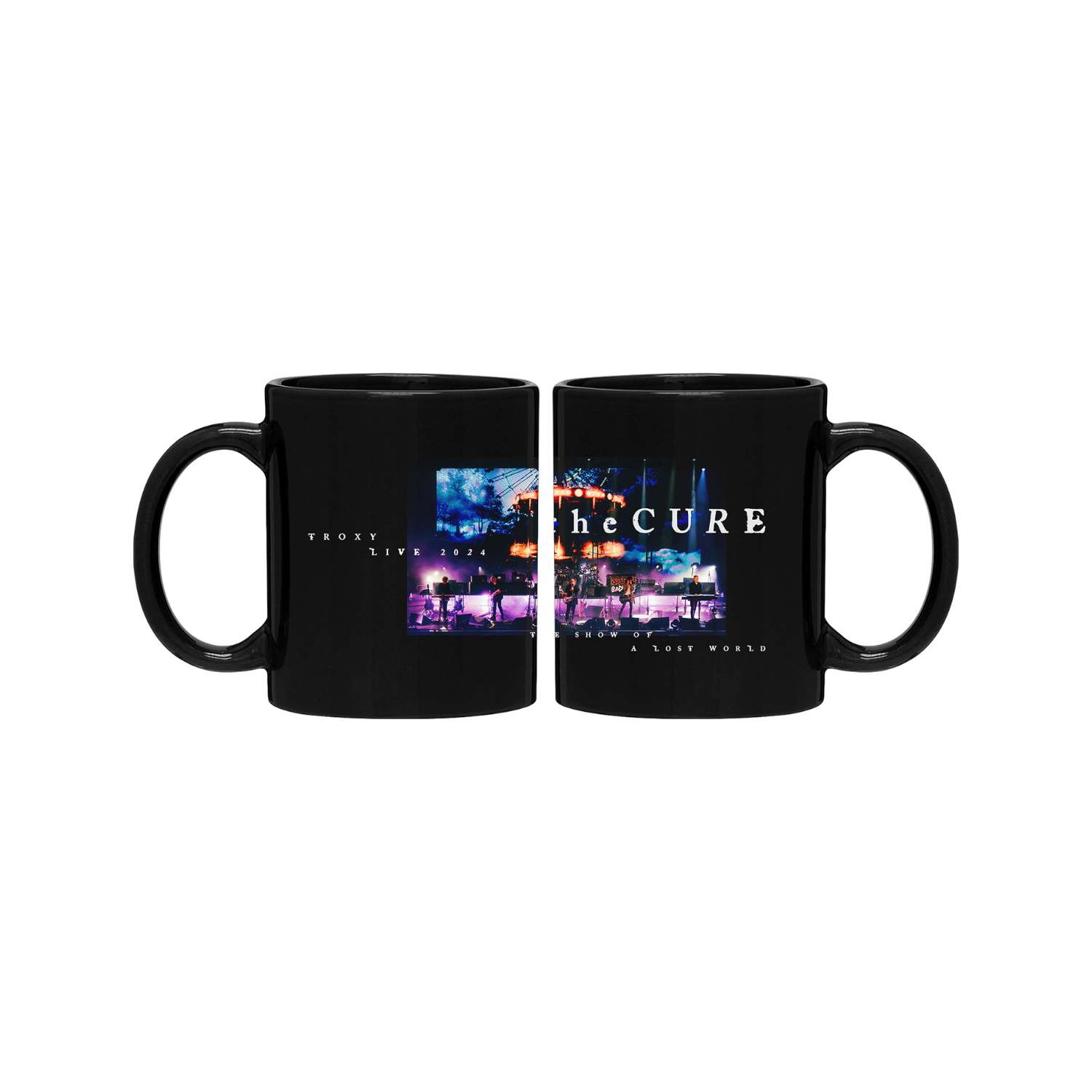 A classic black 11oz coffee mug featuring a design inspired by The Show Of A Lost World: Troxy Live 2024.