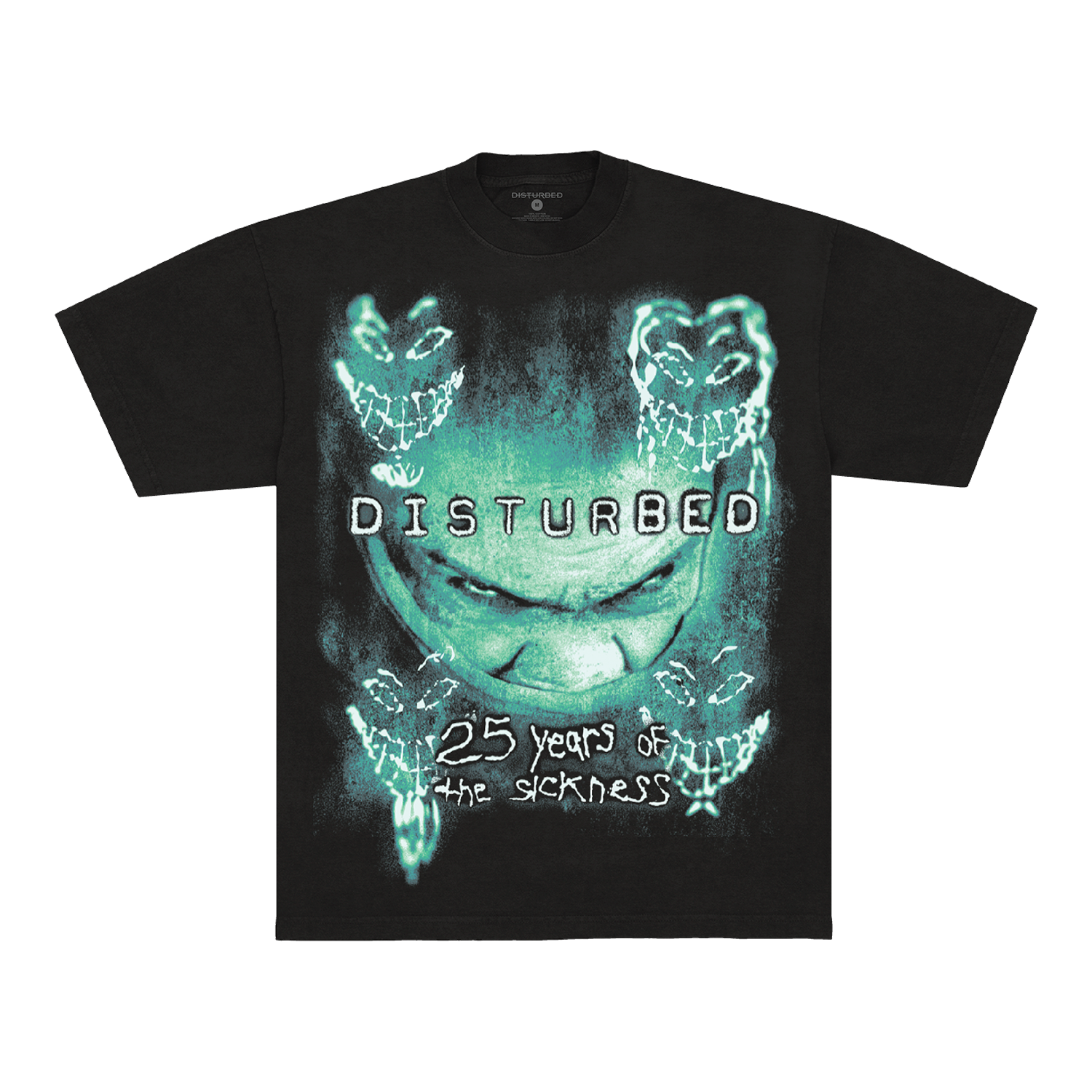 The Sickness art with Disturbed logo, printed on front of a black tee.