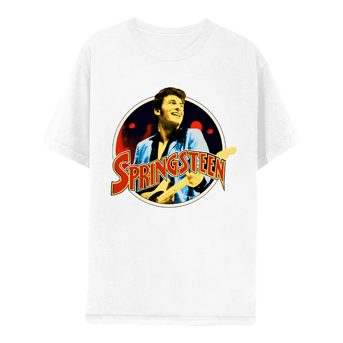 Bruce Springsteen Throwback photo on the front and Springsteen and New York City logo printed on the back of a white, unisex, 100% cotton t-shirt.