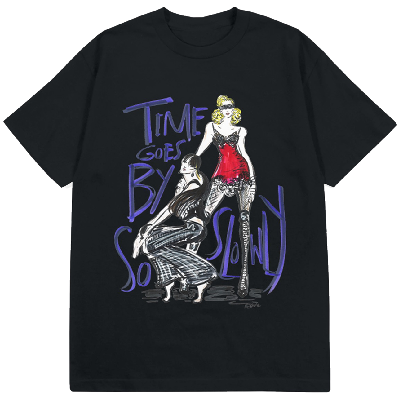 100% cotton short sleeve tee with "Time Goes By So Slowly" sketch artwork on the front and Madonna Celebration Tour logo on the back.