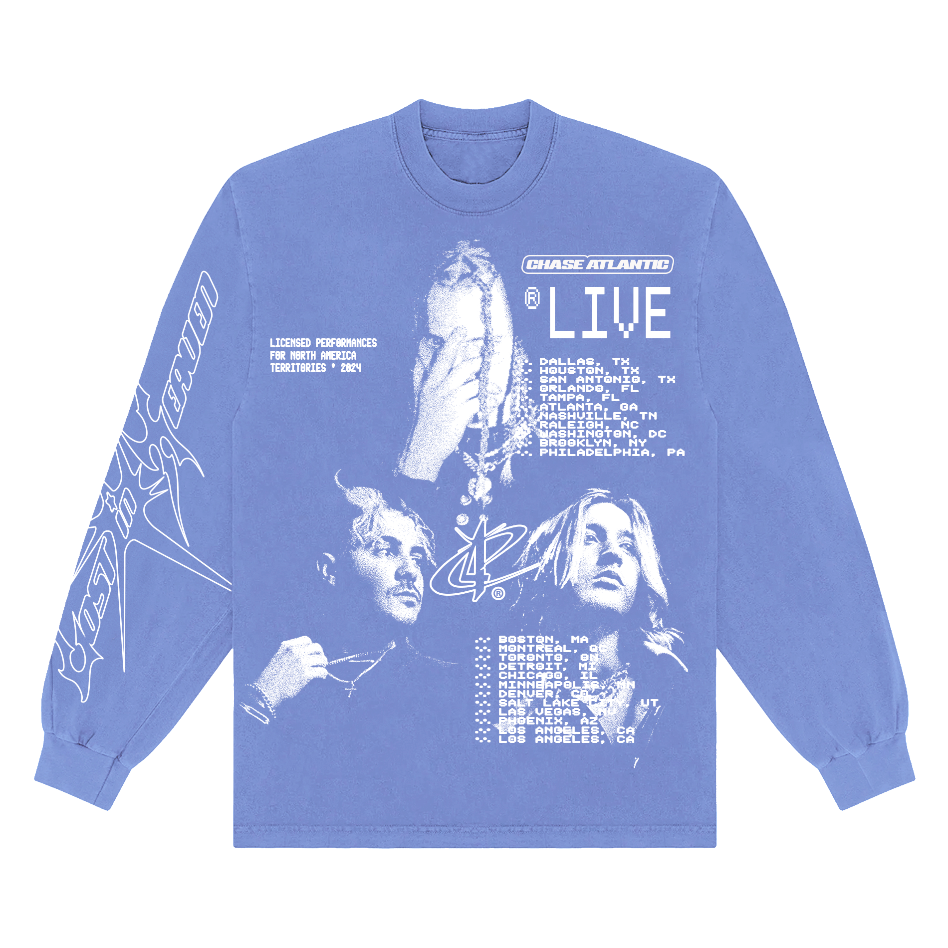 Inspired by the North American Tour, this blue garment dyed longsleeve features all over graphic designs. Printed on a unisex streetwear essential body.