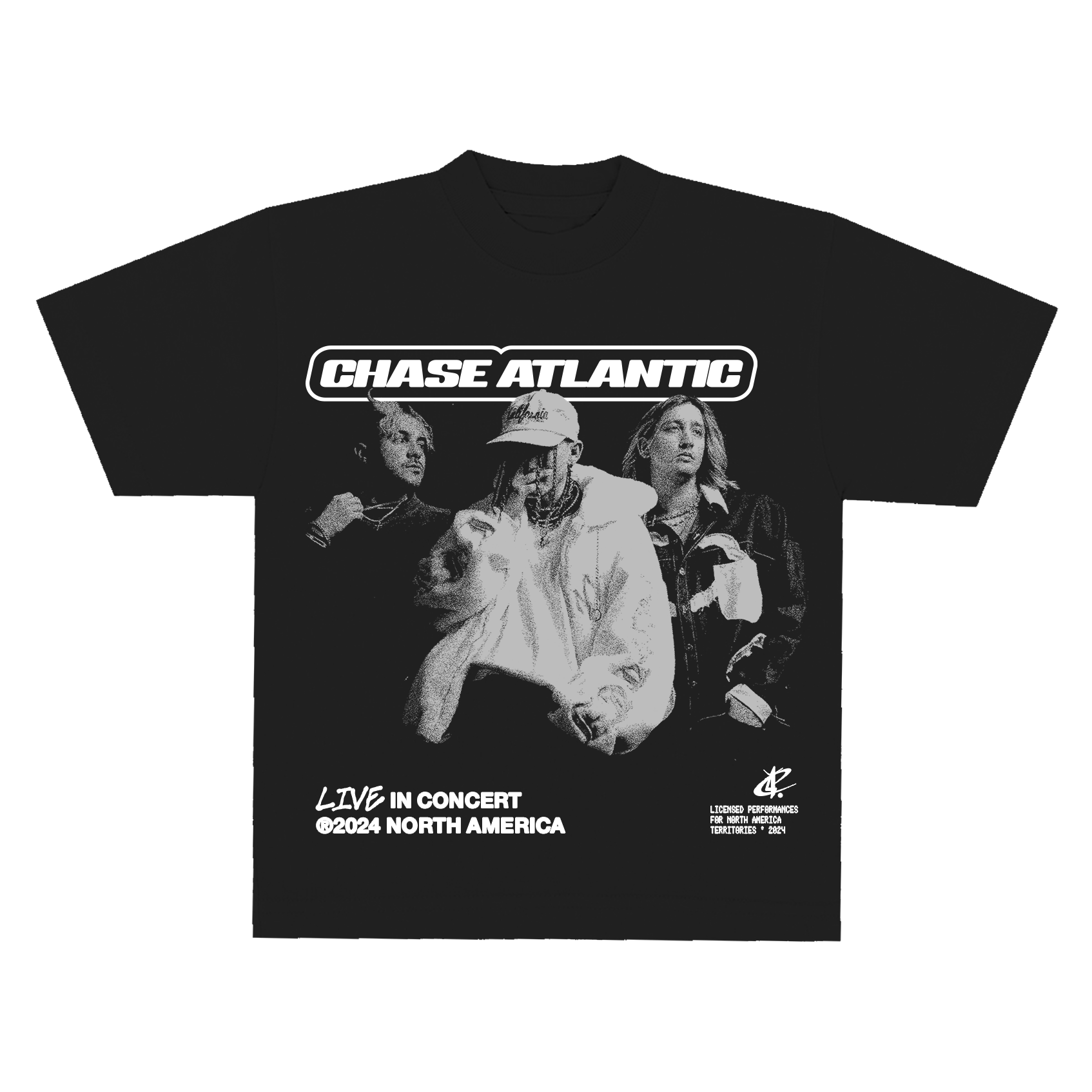 The new Chase Atlantic tee from tour. Black and white photo design on a unisex streetwear essential body, inspired by the North American tour.