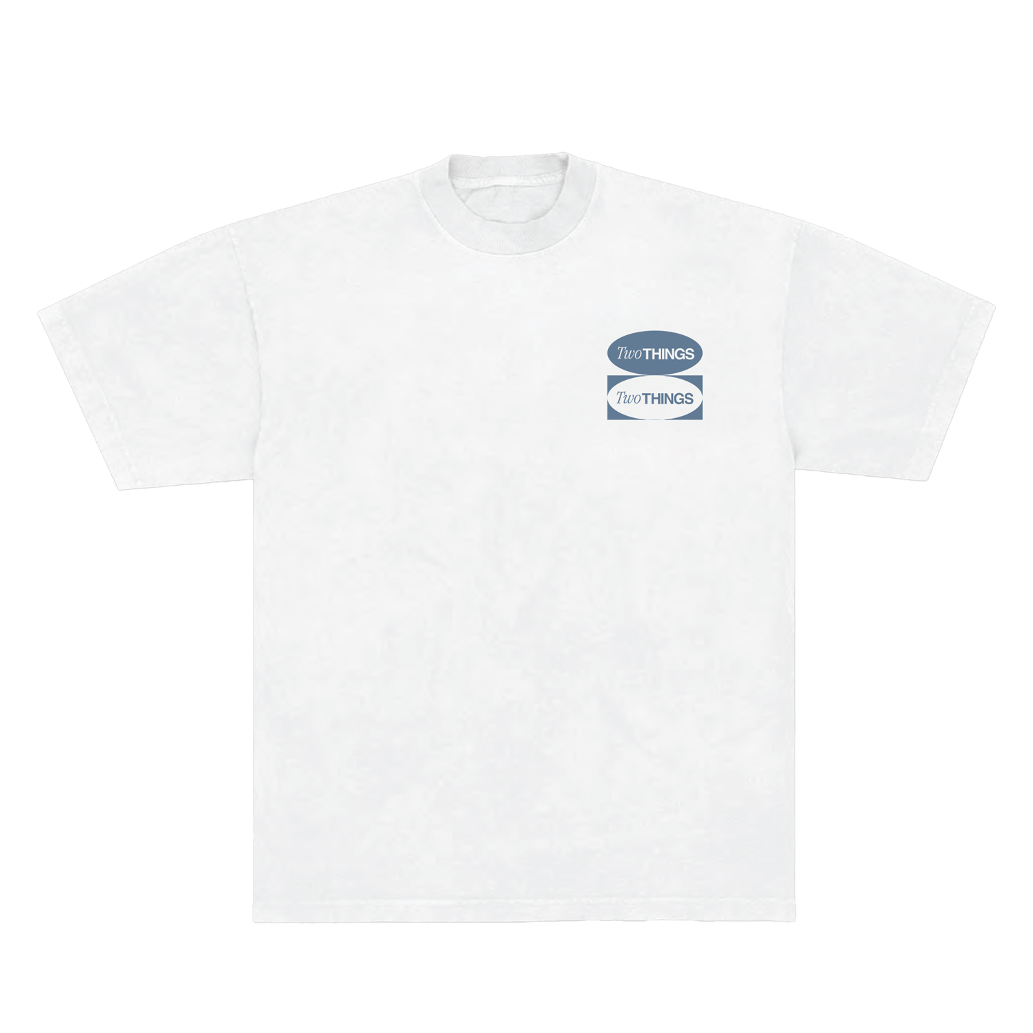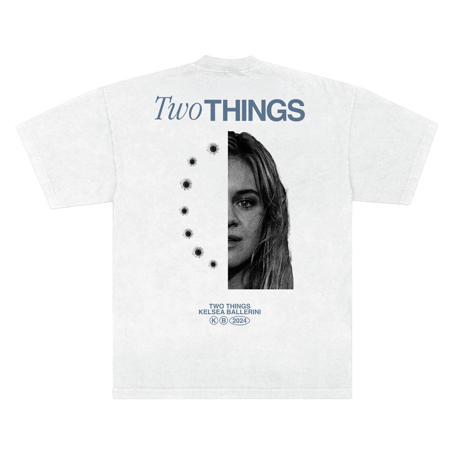 Two Things doubled on front left chest, daisies with Kelsea portrait on back printed on a white comfort colors tee.