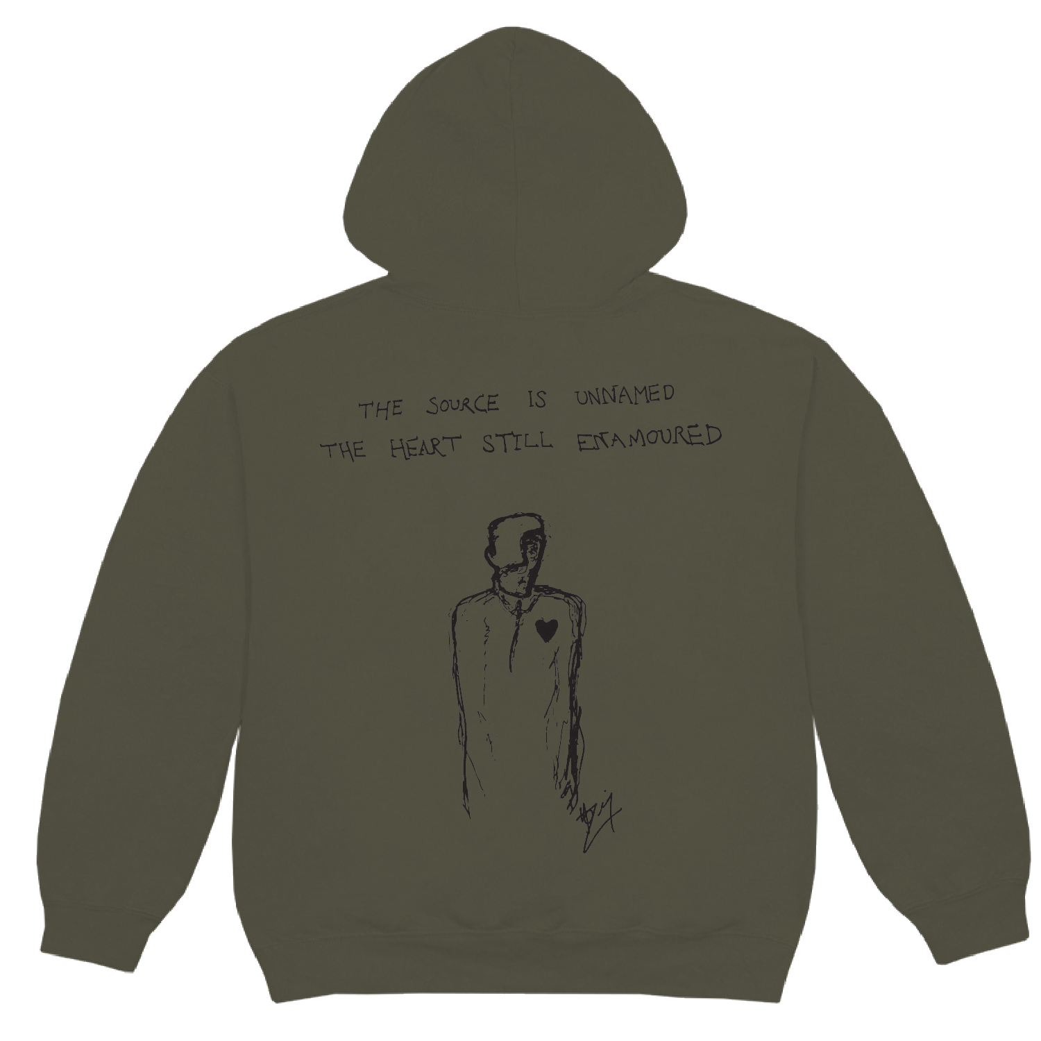 Unisex Military Green Hoodie featuring Hozier logo on the front chest and Unknown hand drawn artwork on the back. Original art by Hozier.